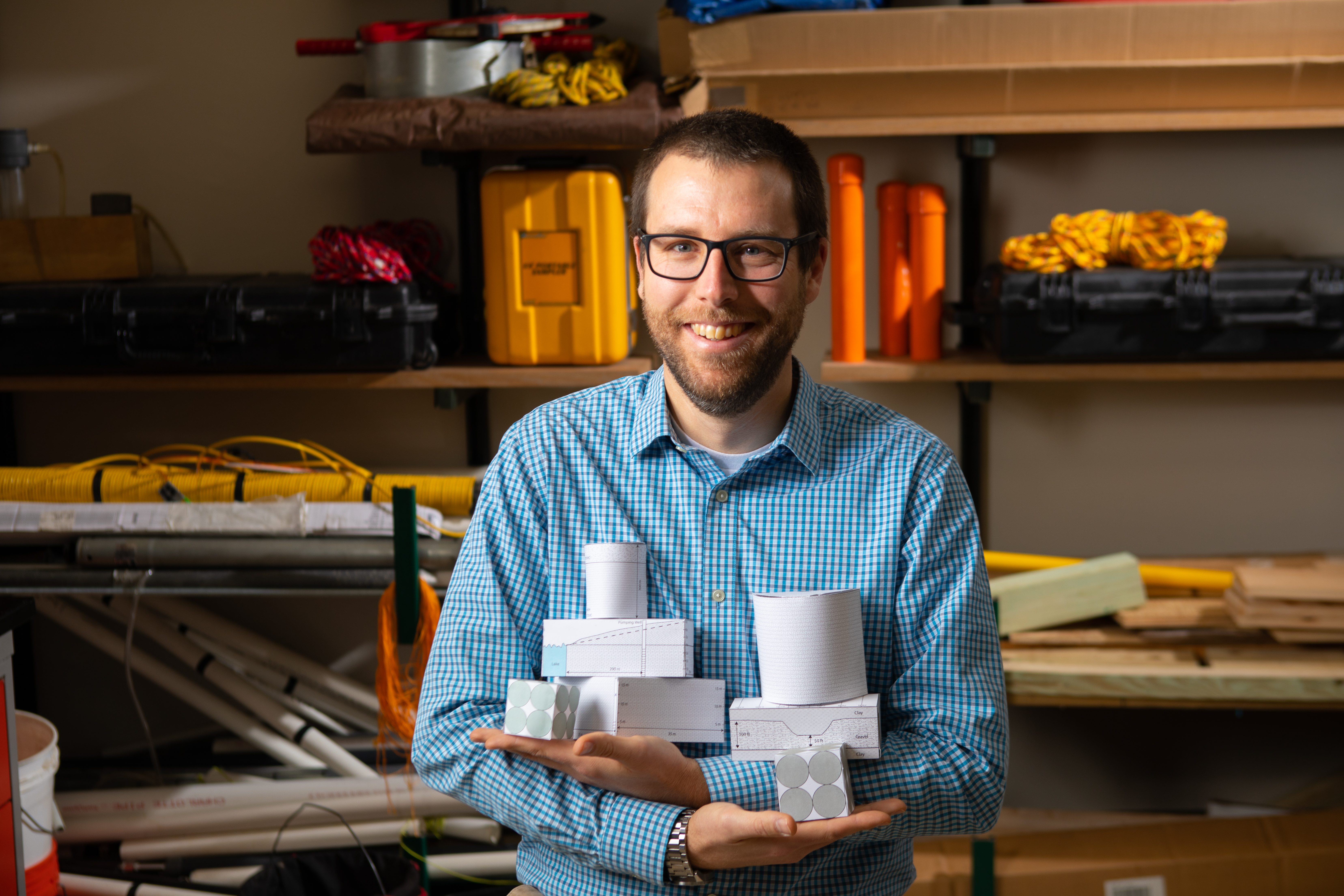 Chris Lowry, a University at Buffalo hydrology researcher, is creator of the Foldable Aquifer Project. Credit: Douglas Levere / University at Buffalo