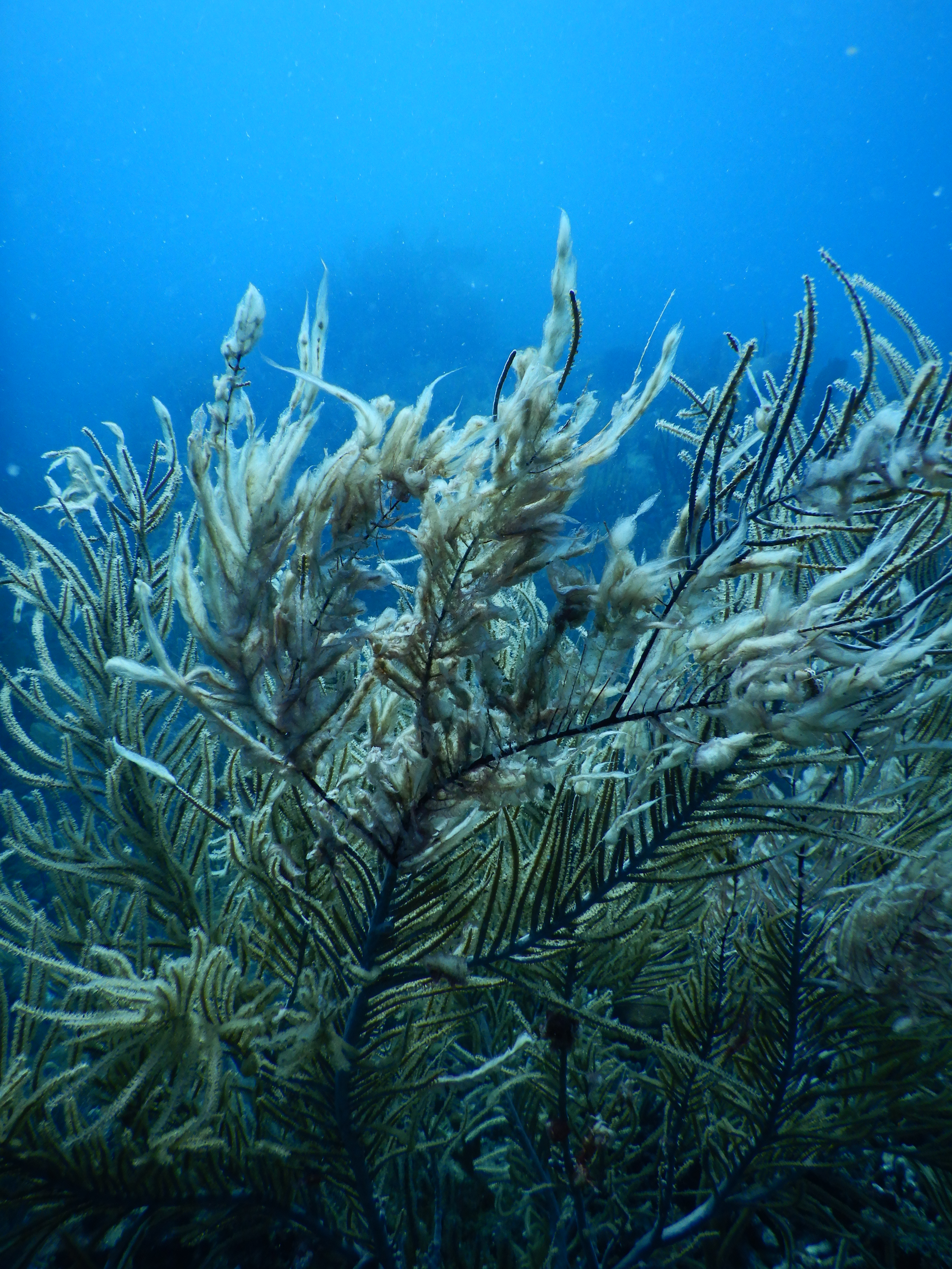 Damaged gorgonian corals on a reef on St. John, U.S. Virgin Islands. The wispy, white strands clinging to the edges of the coral are harmful cyanobacteria, which have grown on injured areas. Credit: Howard Lasker