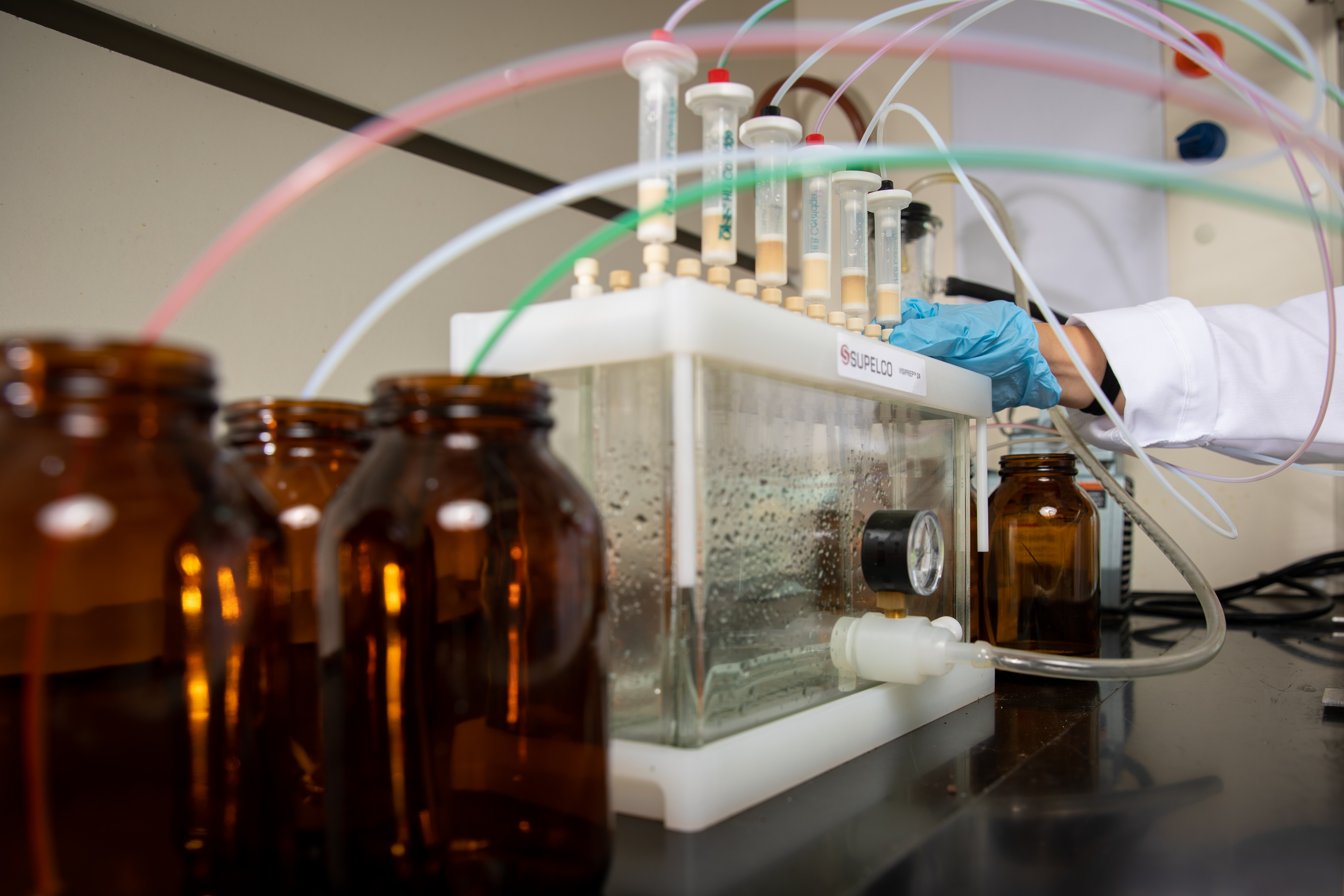 To study pharmaceuticals in water, UB scientists used the system pictured to isolate chemical compounds from water samples. Credit: Meredith Forrest Kulwicki / University at Buffalo