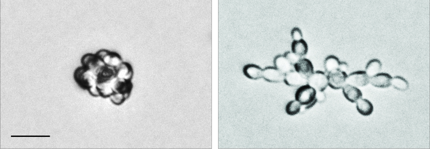 Colonies of baker’s yeast, or Saccharomyces cerevisiae, pictured under a microscope. Yeast don’t grow this way in bread dough: The images are from a 2016 study in the lab of UB biologist Paul Cullen that explored cellular mechanisms that cause certain changes in yeast growth patterns. In glucose-rich conditions on a flat laboratory plate (left), the yeast cells grow in a tight cluster. But when glucose is limited (right), new cells grow outward, forming a filament-like configuration that may aid in the search for food. Bar, 10 microns. Credit: Paul J. Cullen