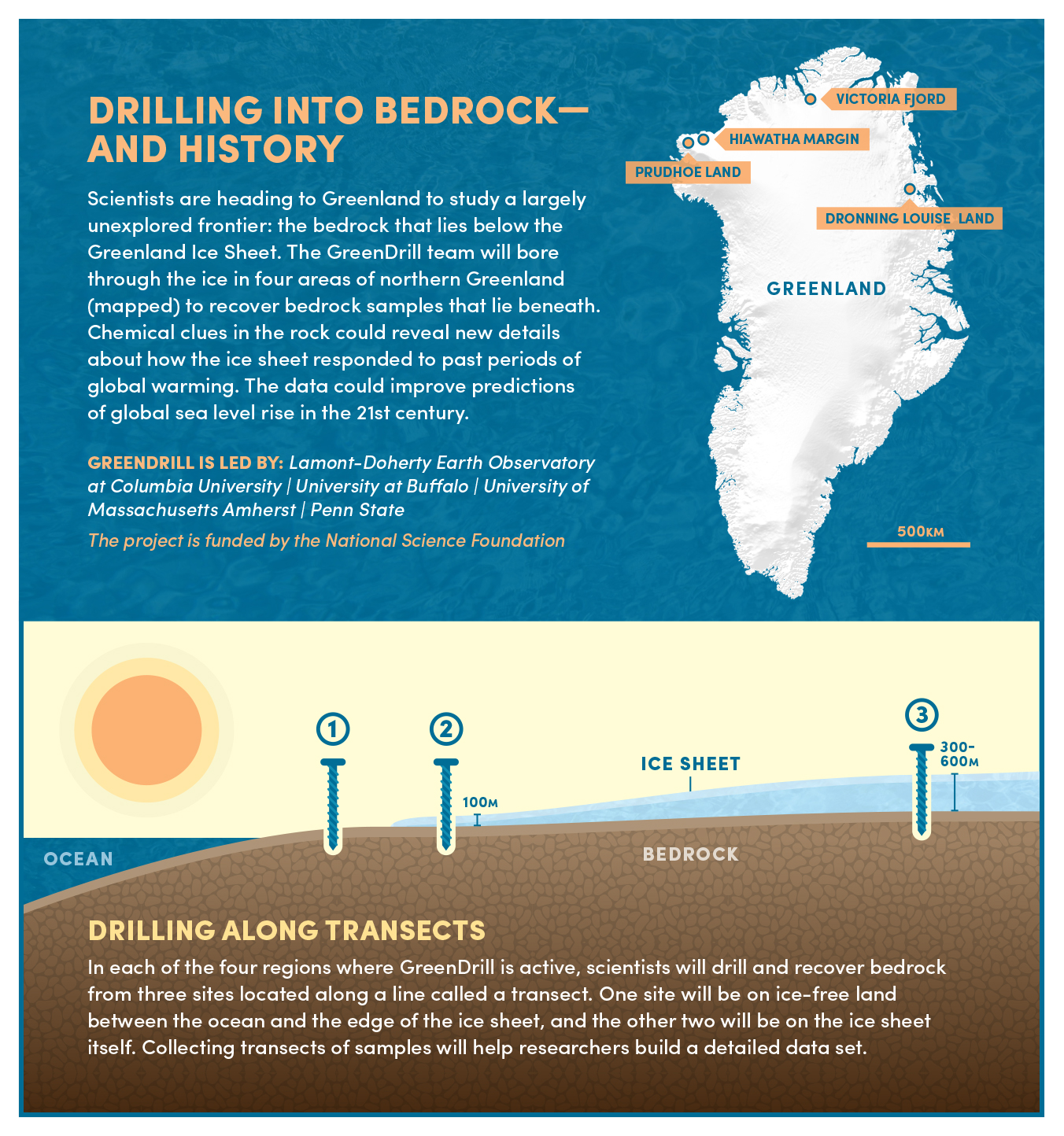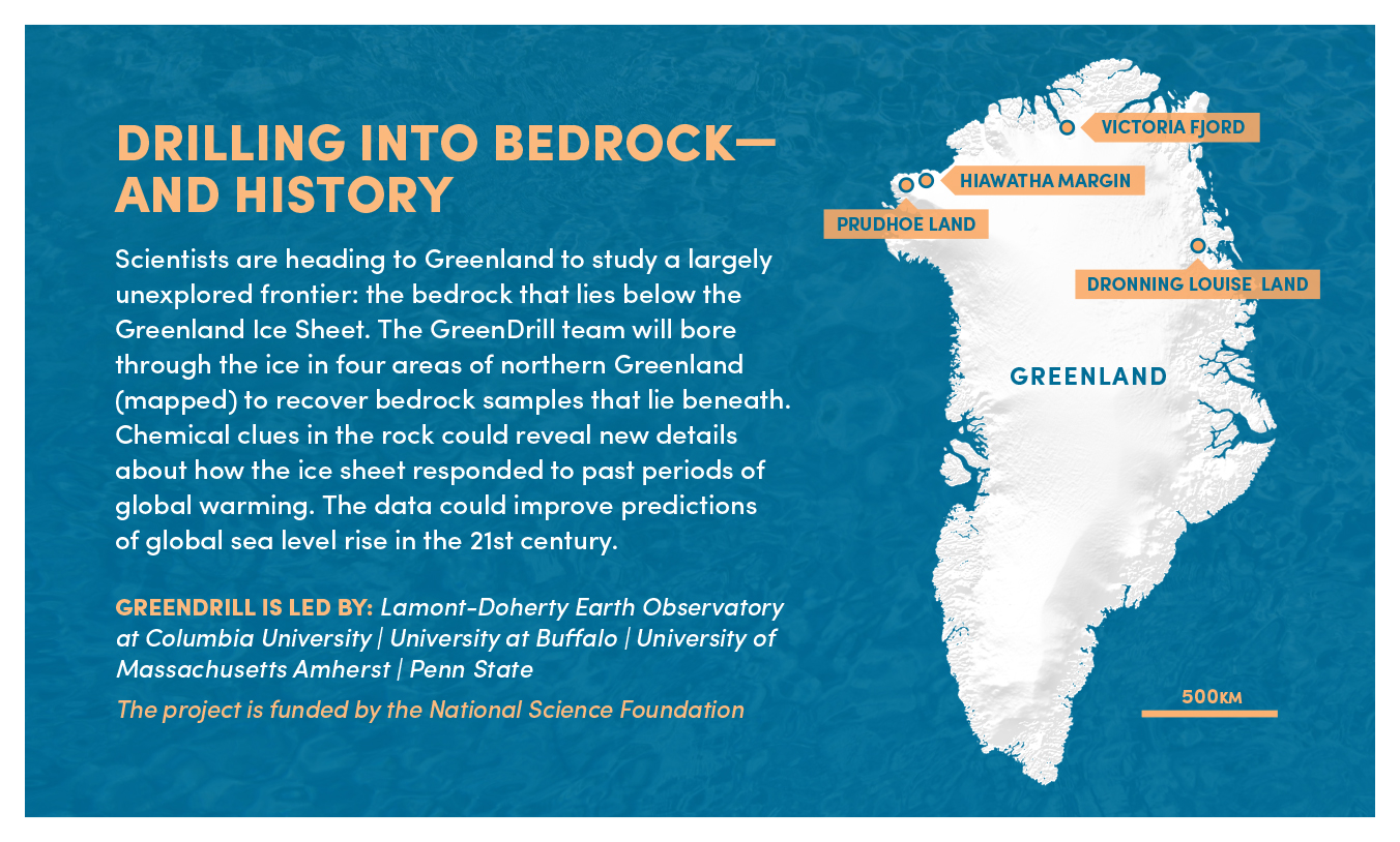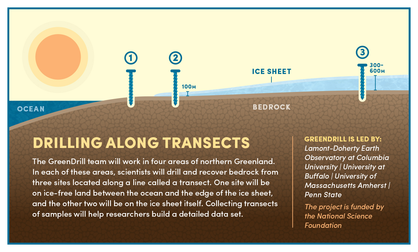 The GreenDrill team aims to unearth new details about the history of the Greenland Ice Sheet. Questions they will try to answer include: Did ice in northern Greenland disappear completely during periods of warmth about 400,000 and 100,000 years ago? How sensitive is the northern portion of the ice sheet to temperature change? Paired with findings from other studies, the research could also help scientists figure out when the entire Greenland Ice Sheet last melted away.