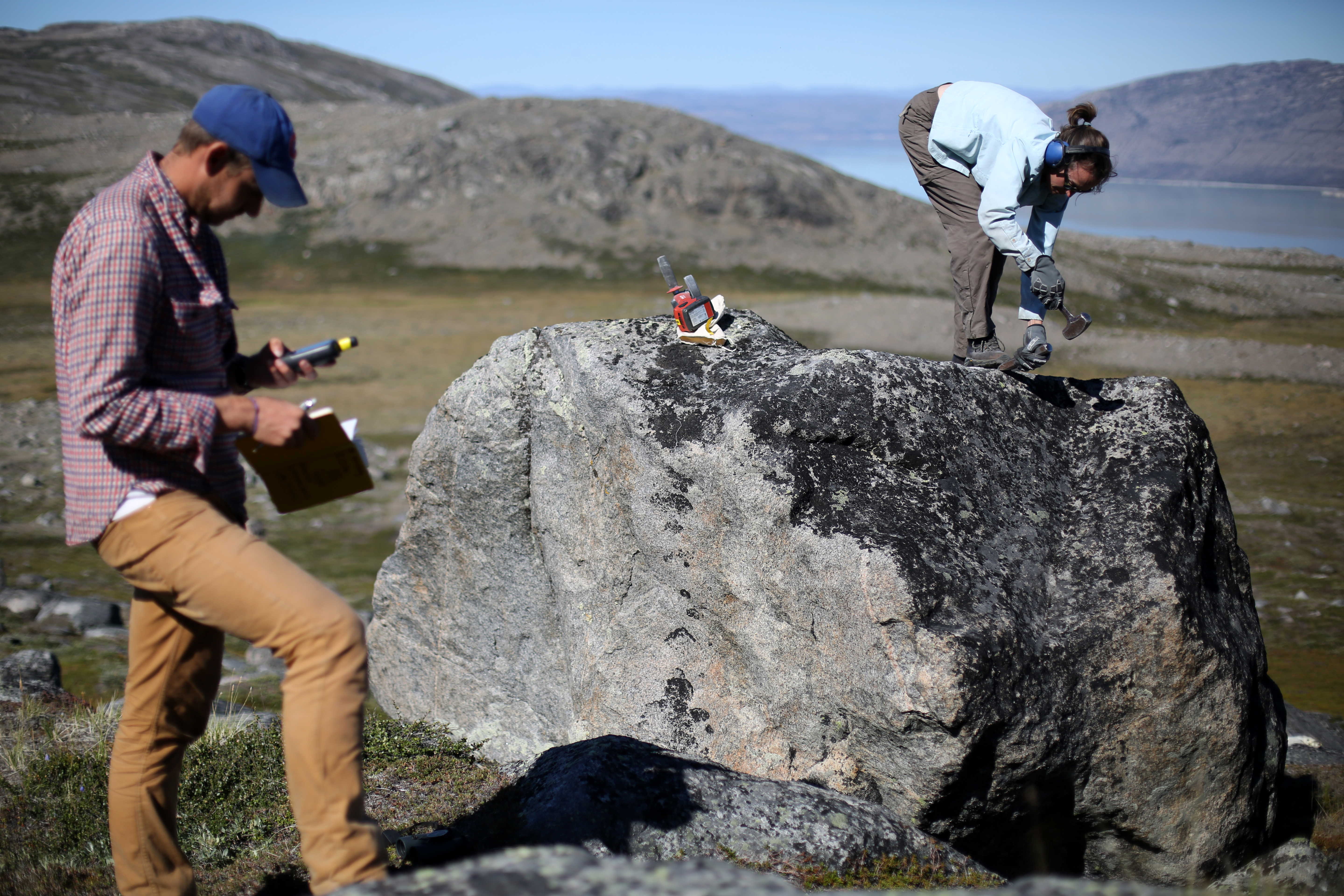 Scientists collect samples from boulders in Greenland. These samples contain chemical isotopes that can help scientists determine the ancient boundaries of the ice sheet. Credit: Jason Briner