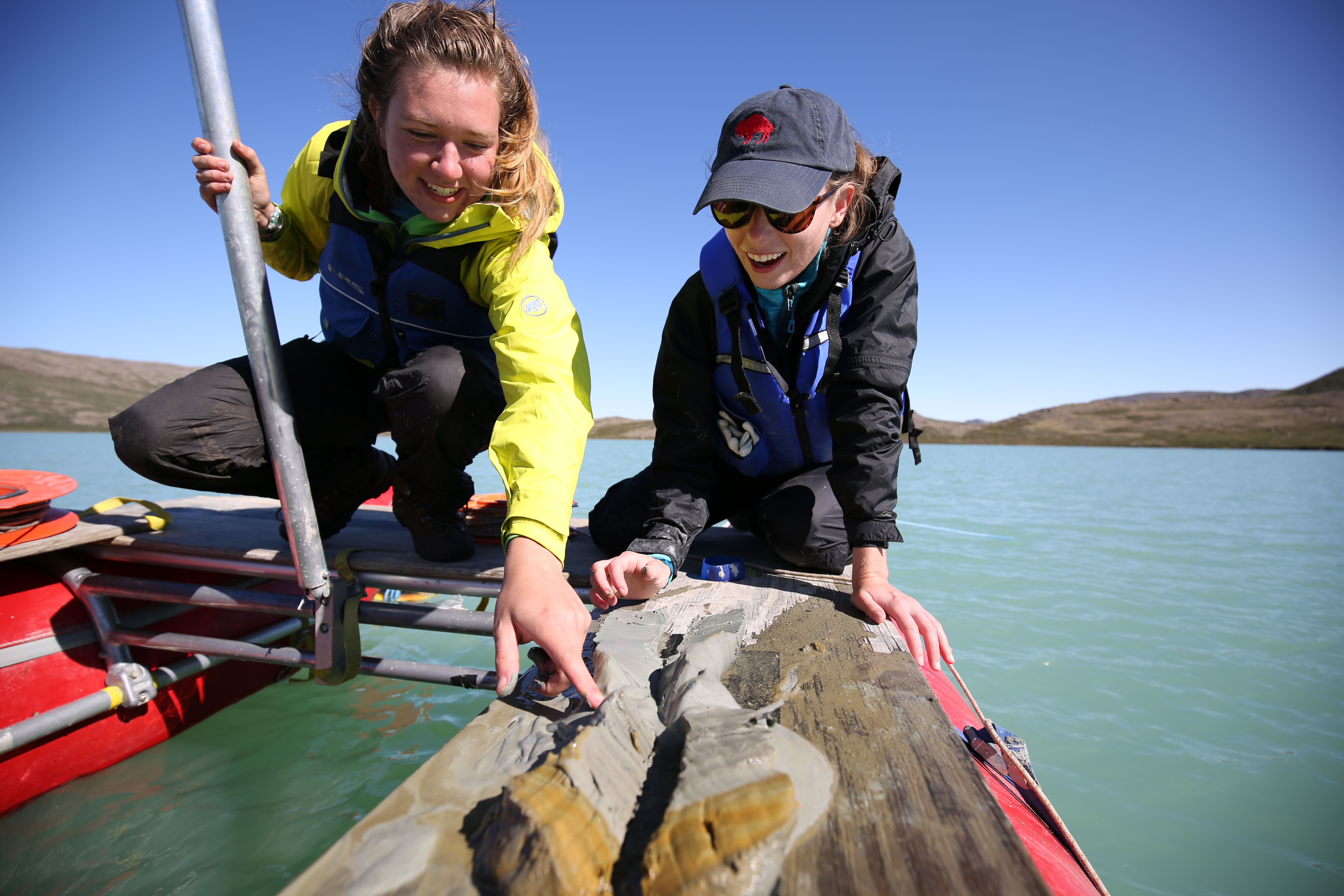 Study co-authors Allison Cluett and Alia Lesnek examine a sample of lakebed mud from Greenland. Such samples help scientists reconstruct the ice sheet’s ancient boundaries. Cluett is a University at Buffalo PhD student, and Lesnek is a University at Buffalo PhD graduate and postdoctoral scholar at the University of New Hampshire. Credit: Jason Briner