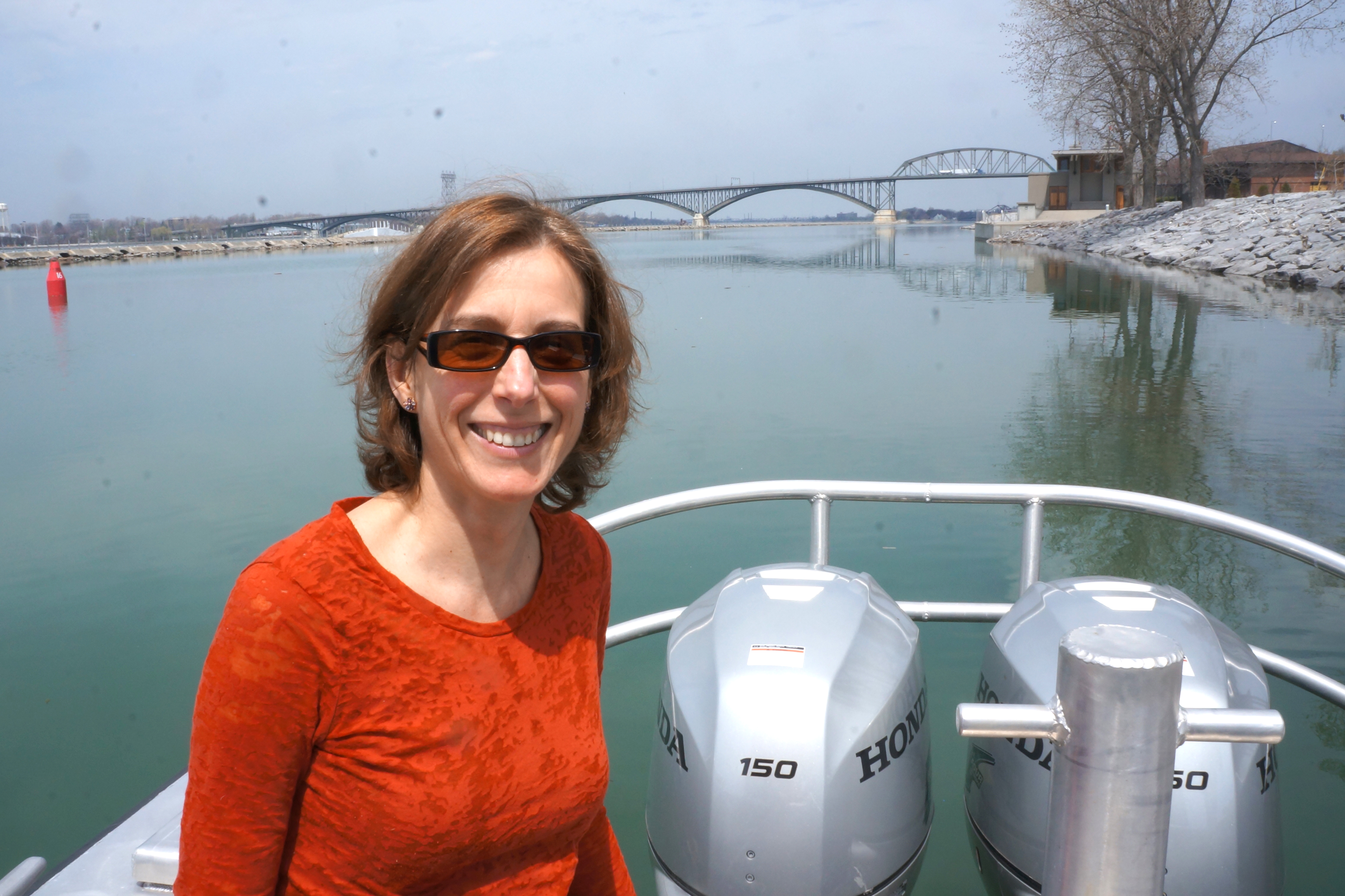 Alicia Pérez-Fuentetaja, Professor of Biology and Research Scientist at the Biology Department and Great Lakes Center at SUNY Buffalo State, aboard a research boat on the Niagara River.
