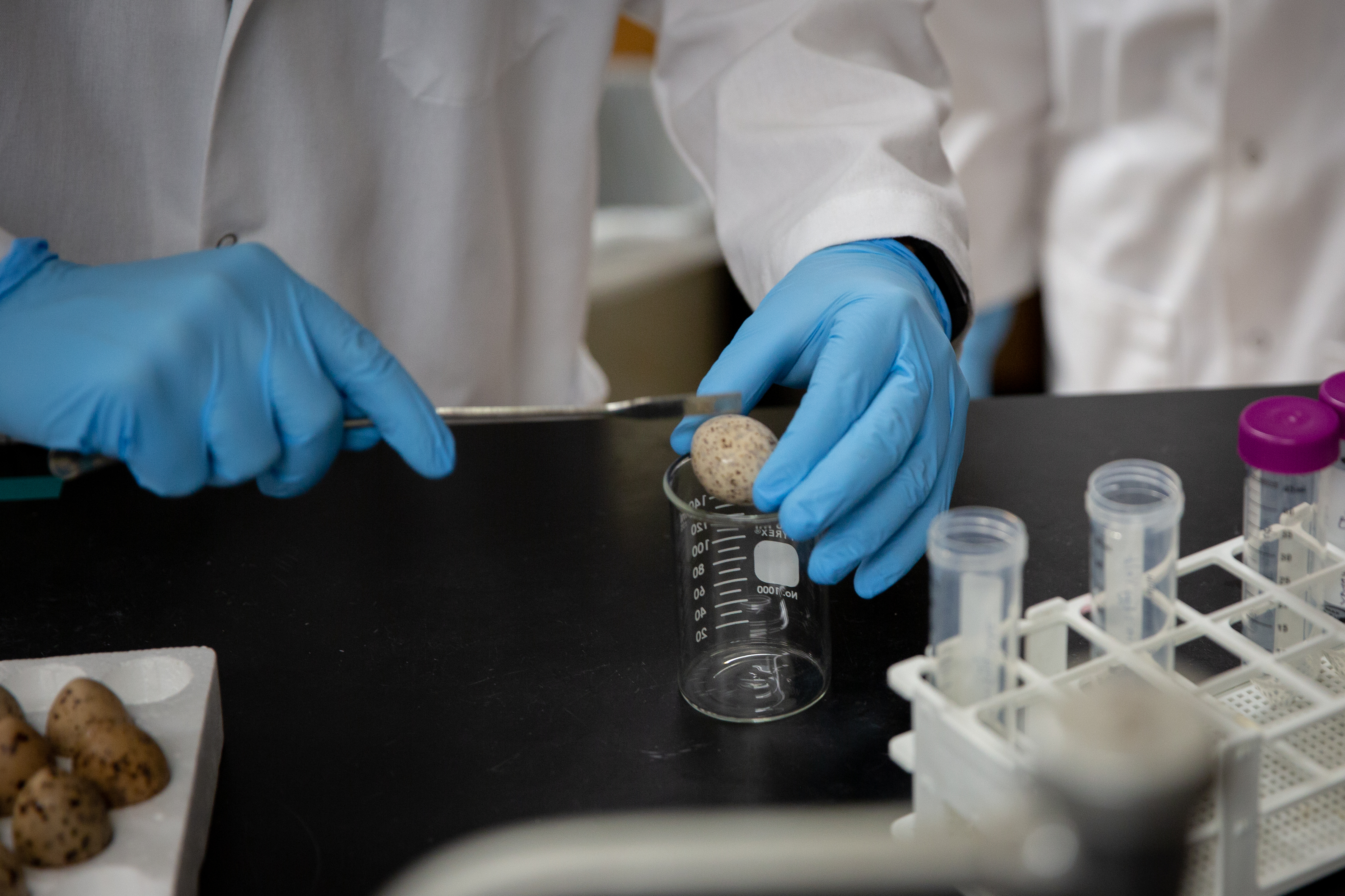 University at Buffalo researcher Steven Travis cracks an abandoned tern egg into a beaker. Though a 2020 study published in Environment International focuses on common tern chicks, juveniles and adults, Travis and colleagues have begun work on a study examining the levels of pollutants in common terns' and other wild aquatic birds’ eggs. Credit: Meredith Forrest Kulwicki / University at Buffalo