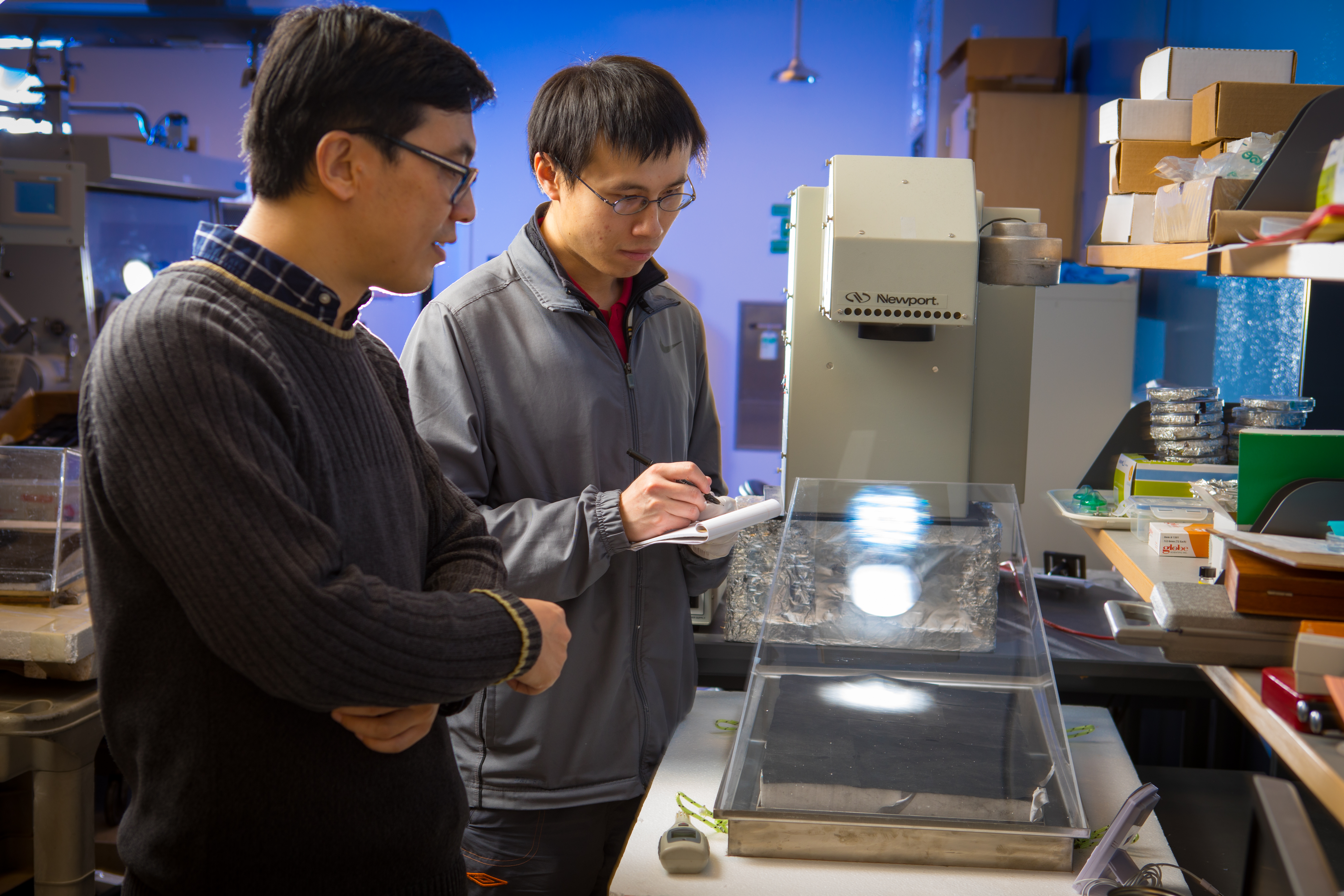 Left to right: Qiaoqiang Gan, UB professor of electrical engineering, and Haomin Song, a UB electrical engineering PhD graduate, test materials in the lab. Both are also members of the Sunny Clean Water team. The photograph was taken prior to the pandemic. Credit: Douglas Levere / University at Buffalo
