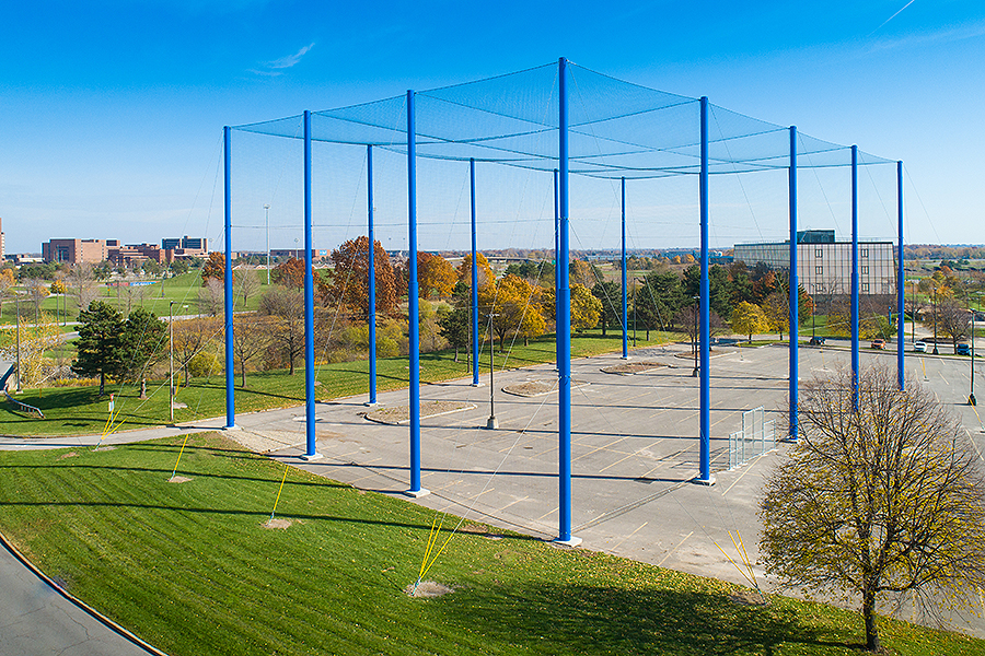 They support a massive enclosed netted complex where University at Buffalo professors, students and partners will conduct experiments on uncrewed aerial vehicles (UAVs), which are more commonly known as unmanned aerial vehicles or drones.