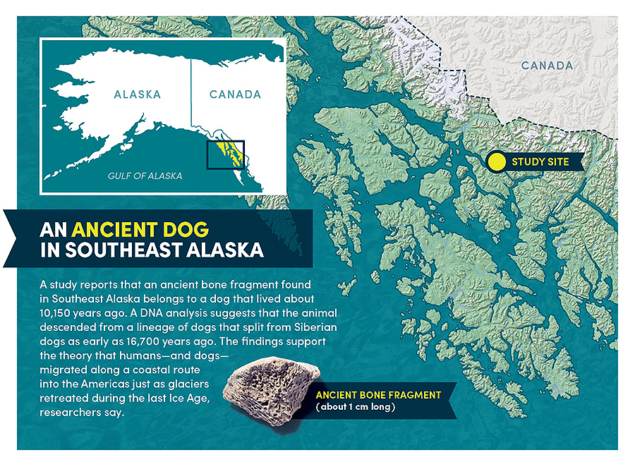 Researchers analyzed the dog’s mitochondrial genome, and concluded that the animal belonged to a lineage of dogs whose evolutionary history diverged from that of Siberian dogs as early as 16,700 years ago. The timing of that split coincides with a period when humans may have been migrating into North America along a coastal route that included Southeast Alaska.