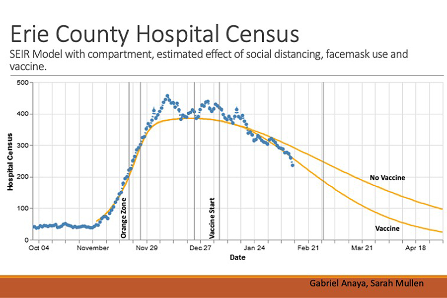 The UB models show that even if vaccinations continue at the rate of about 2,000 shots per day in Western New York, the result will be at least 10% fewer hospitalized patients by March 1 than without vaccinations.