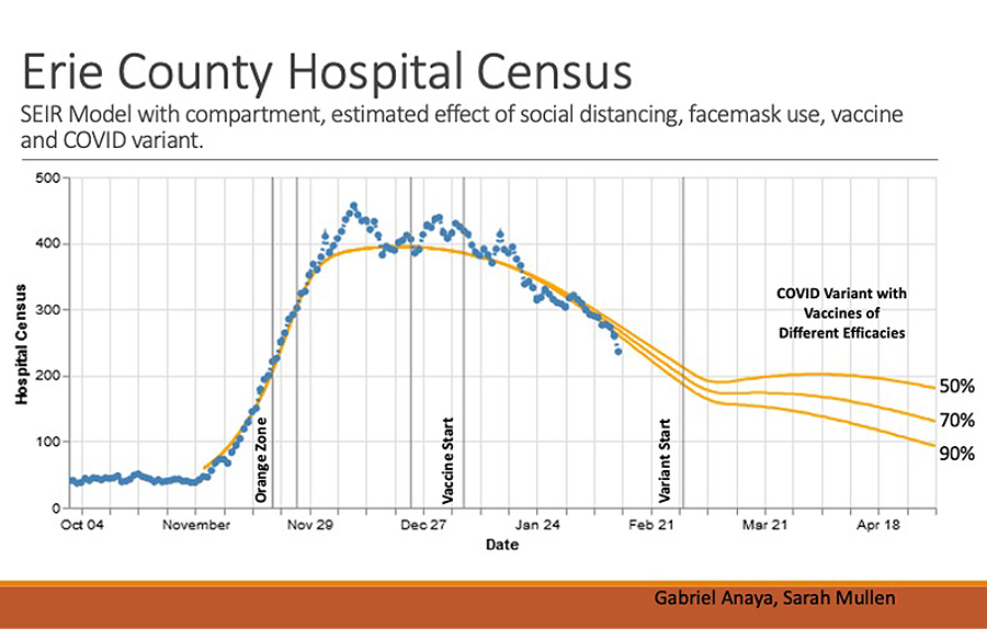 The UB team has been doing presentations for the Erie County Department of Health on local transmission of the virus since last March. The team began with the the classic Susceptible-Exposed-Infected-Recovered (SEIR) epidemiological models and has continually revised them based on changes in the rates of transmission and factors affecting transmission.