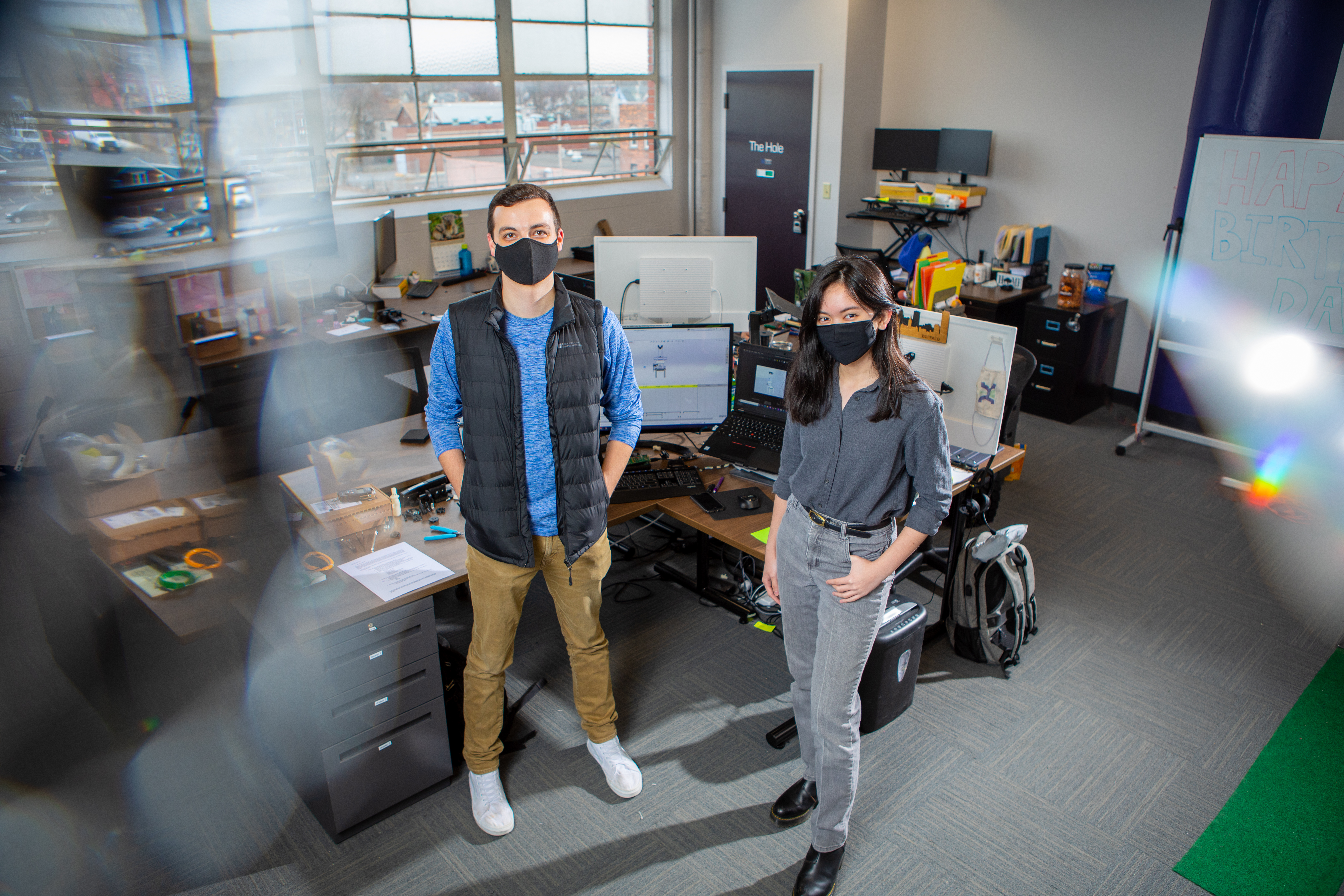 UB mechanical engineering student Marieross Navarro (right) is leading a project that aims to automate the sewing process for cloth masks at a low cost. UB engineering alumnus Daniel Buckmaster is providing mentorship and feedback on design and prototyping through his company, Tresca Design. Credit: Douglas Levere / University at Buffalo