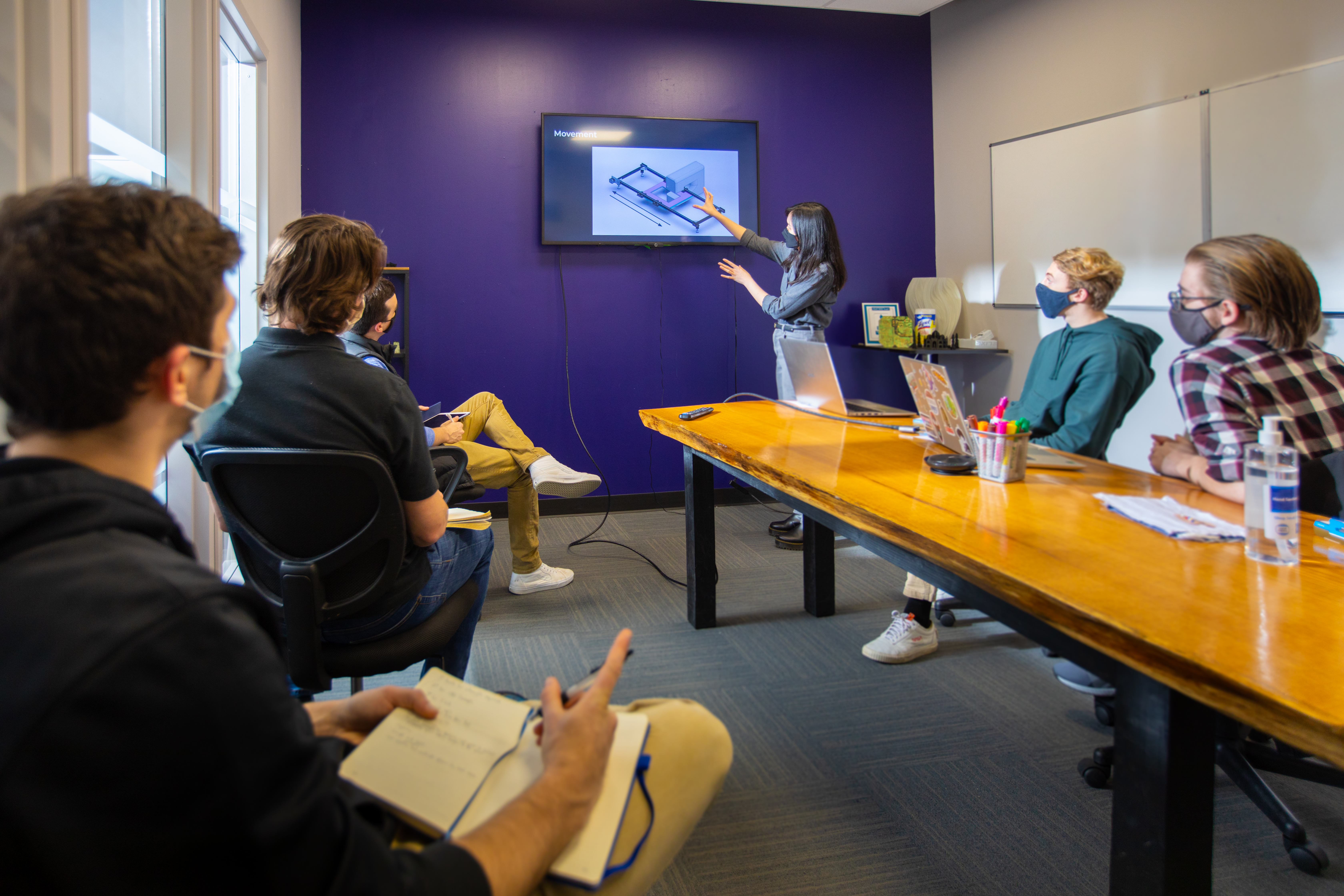 First year UB mechanical engineering student Marieross Navarro (center, standing in front of the screen) presents at a meeting alongside fellow team members Jake Ryan (second from the right) and David Ferris (far right) to product engineers from Tresca Design who are providing feedback on design and prototyping. Credit: Douglas Levere / University at Buffalo