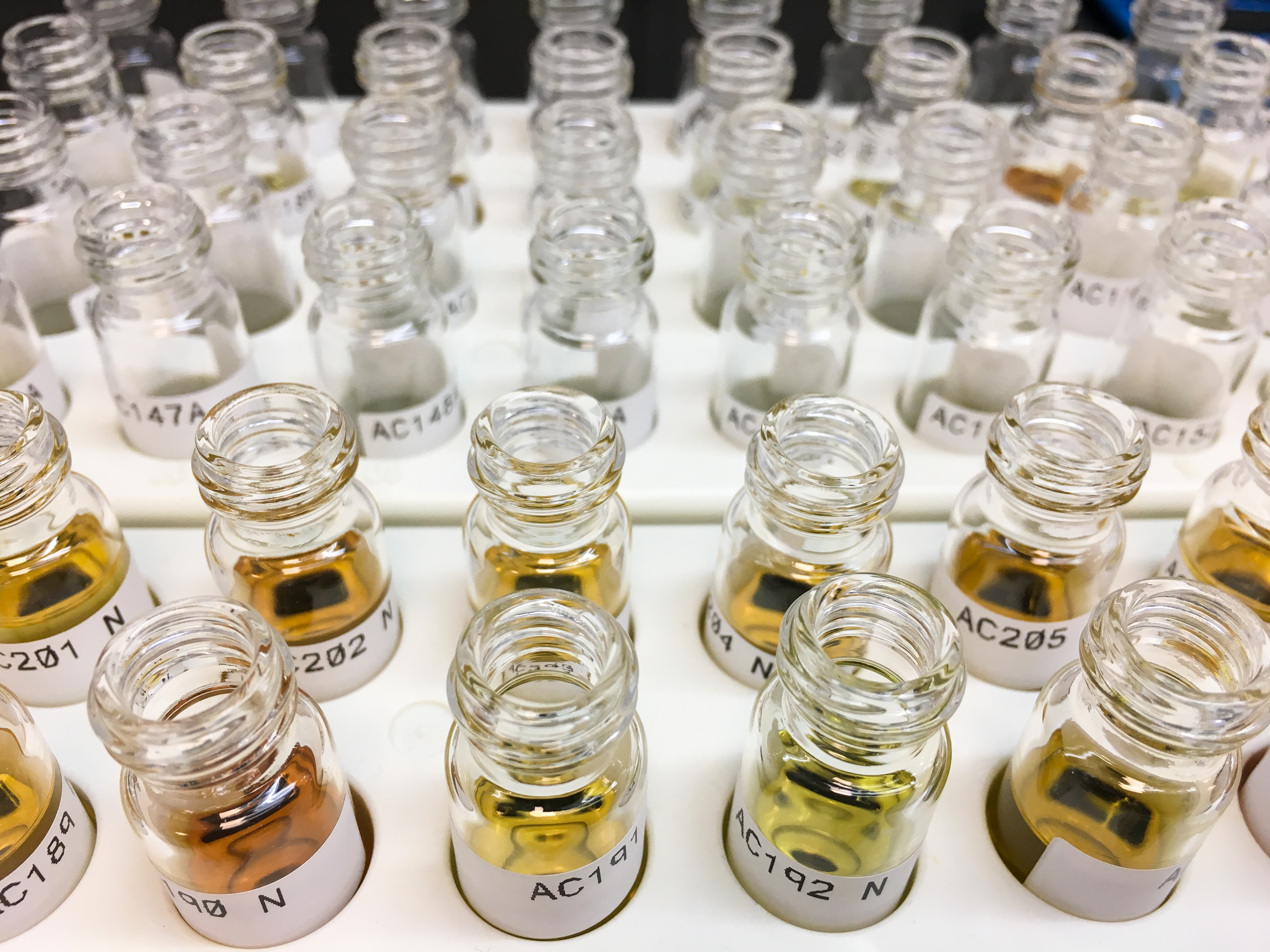 Extracting and analyzing leaf wax chemicals from ocean-bottom and other sediments is a complex process. This photo shows just one of many steps: The vials hold what scientists call the acid fraction, which contains materials including leaf wax chemicals. Credit: Allison Cluett. Download additional photos.