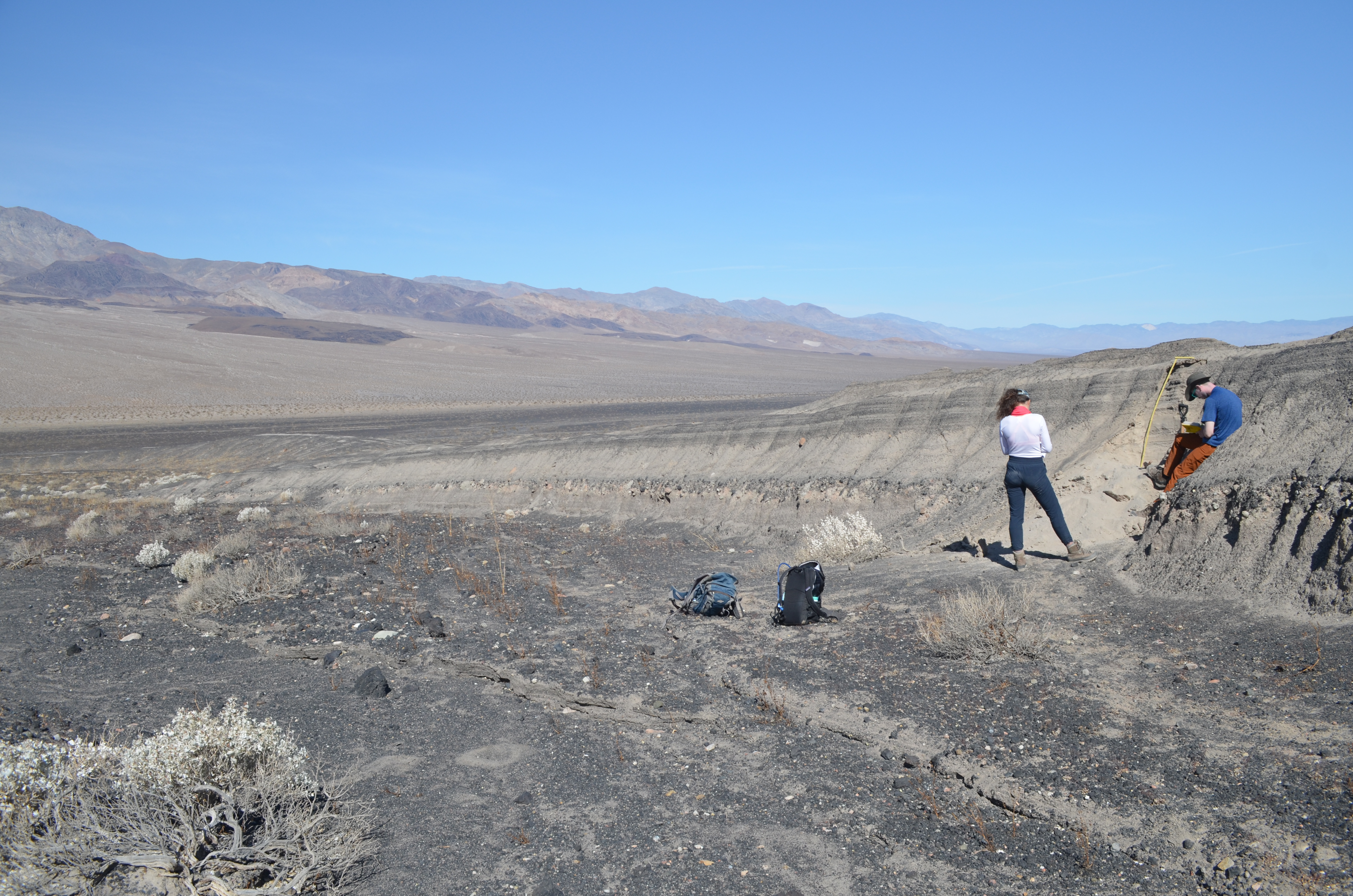 UB geology master’s students Anastasia Rashchupkina (left) and Brandon Keim document layers of volcanic deposits at the Ubehebe study site. Credit: Greg Valentine