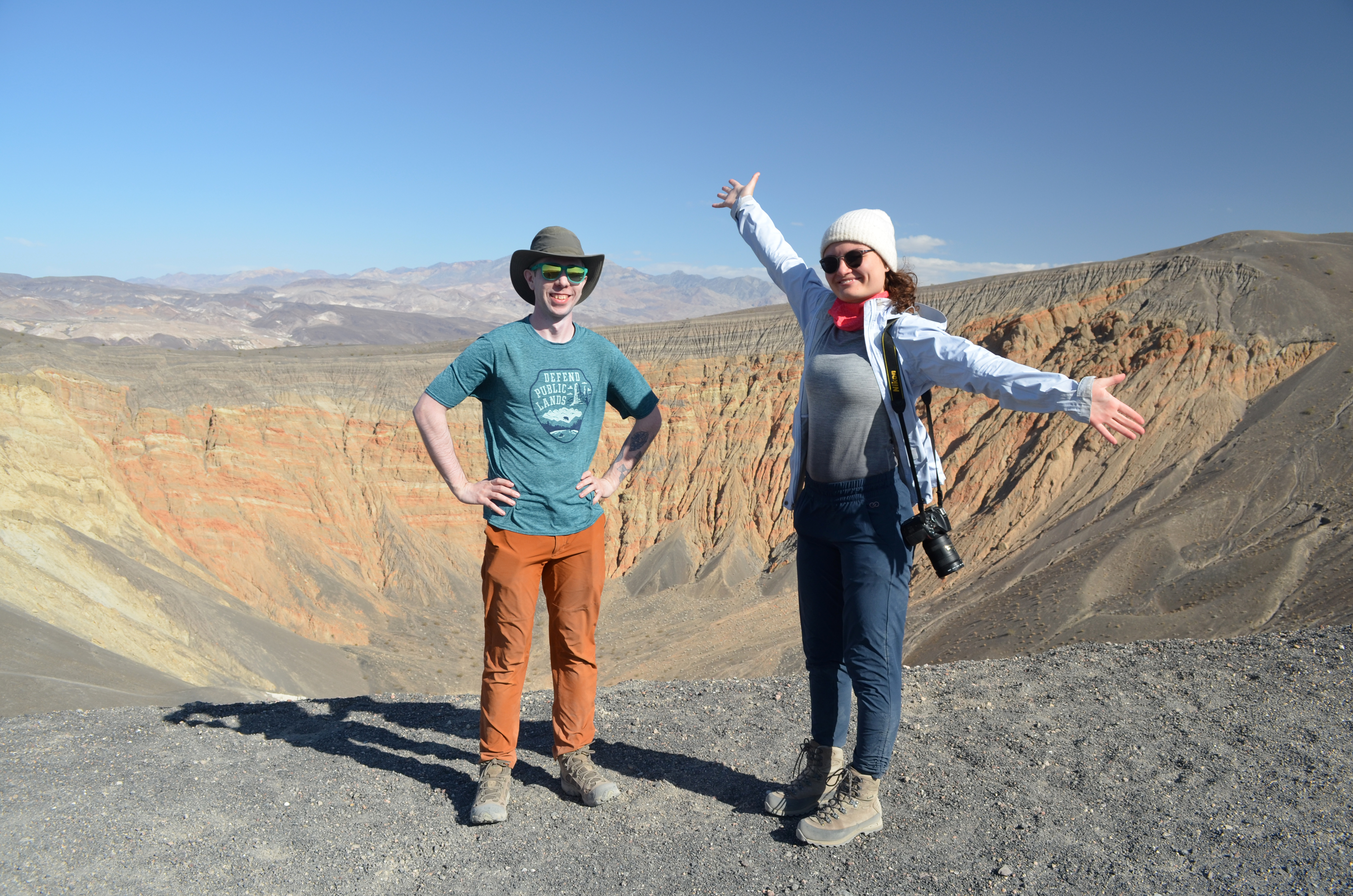UB geology master’s students Brandon Keim (left) and Anastasia Rashchupkina on the edge of Ubehebe Crater. Credit: Greg Valentine