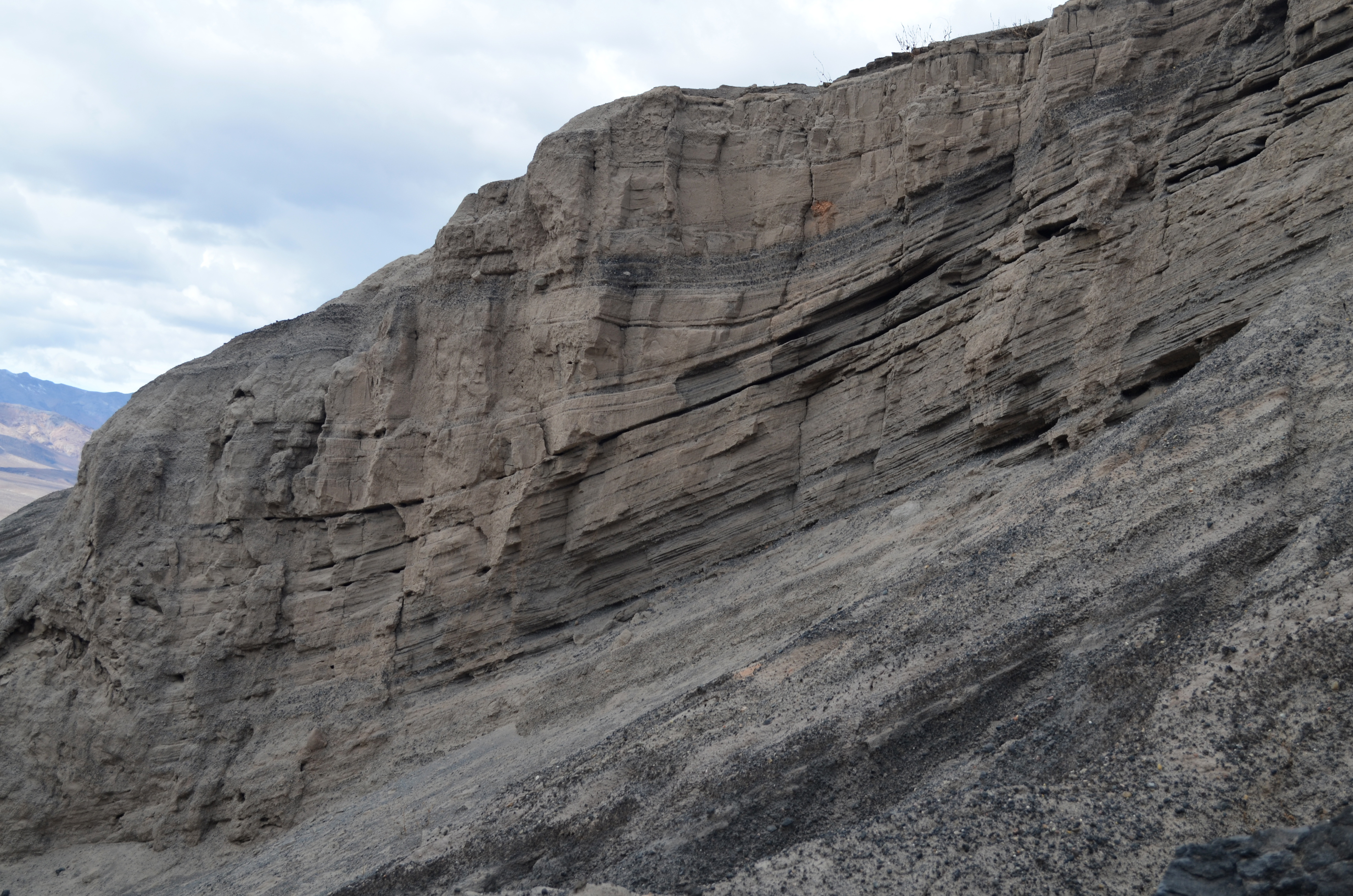 Layers of volcanic deposits at the Ubehebe study site. Scientists can study these layers for clues about the history of eruptions. Credit: Greg Valentine