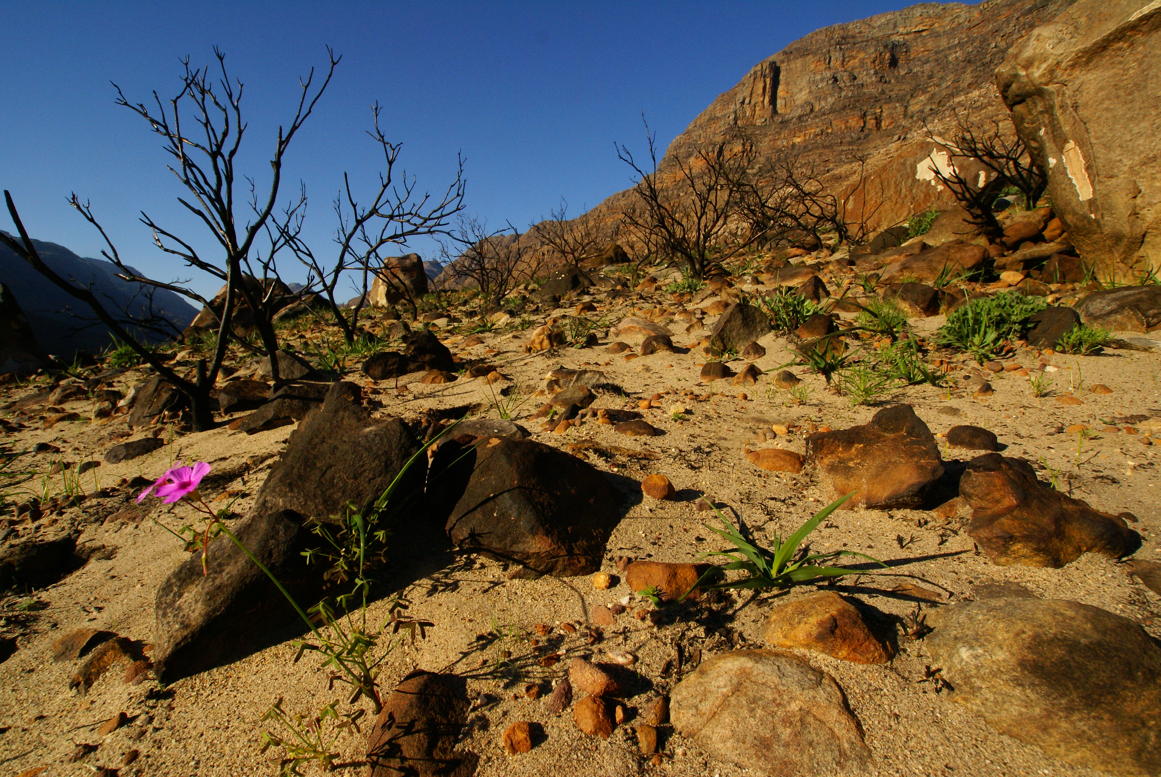 New plant life emerges in the fynbos of South Africa after a wildfire. Such fires, which help many native plants reproduce, make it difficult to detect unusual changes in vegetation. Credit: Adam Wilson