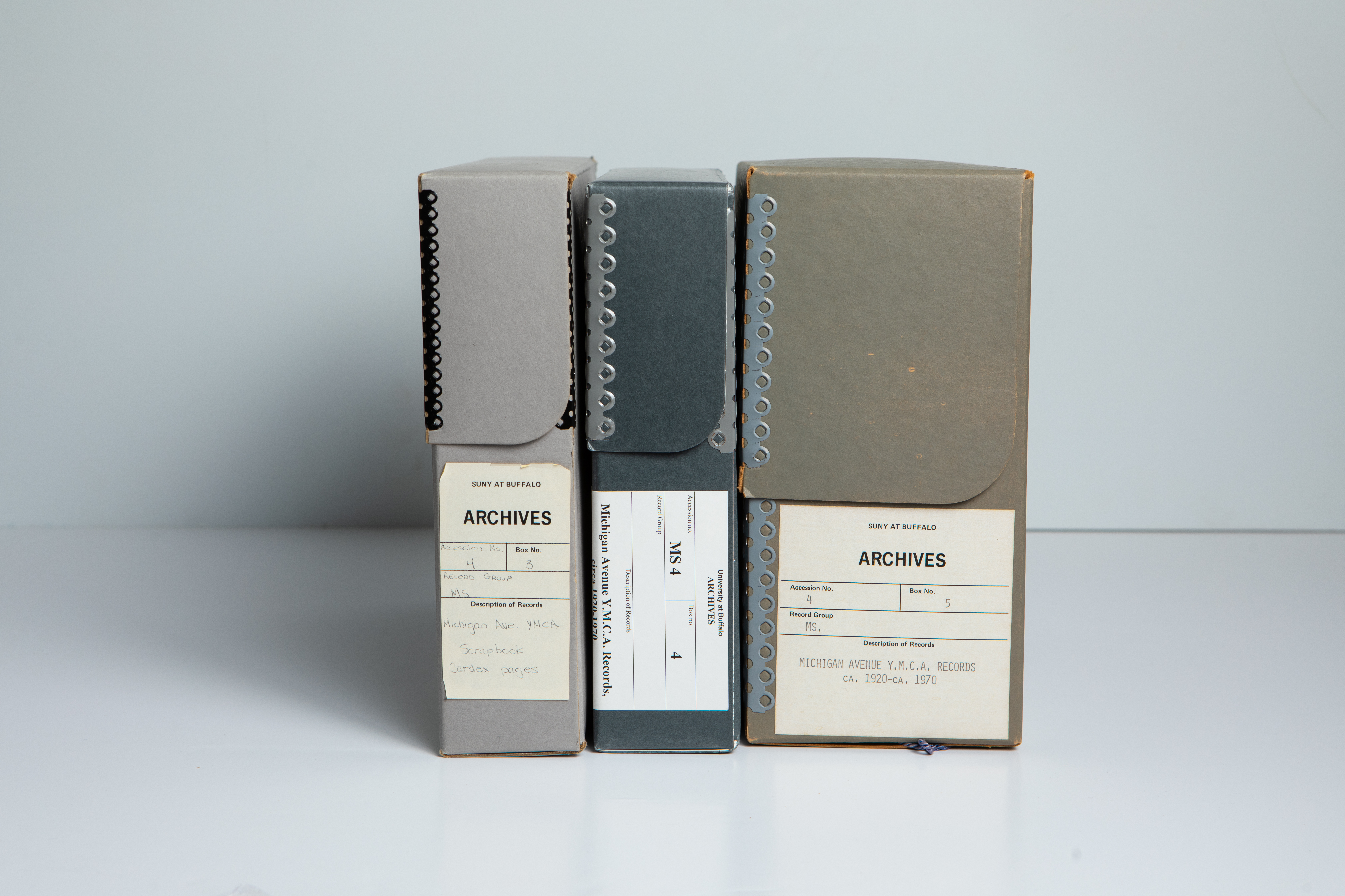 Storage boxes hold records from the Michigan Avenue Y.M.C.A. in Buffalo. The items are part of a collection preserved by Lillian S. Williams, who partnered with the Y.M.C.A branch to house its records at the University Archives, University at Buffalo, the State University of New York. Williams was first vice-president of the Afro-American Historical Association of the Niagara Frontier at the time she collected the items as part of the association’s initiative to preserve records pertaining to Buffalo's African American community. Credit: Douglas Levere / University at Buffalo