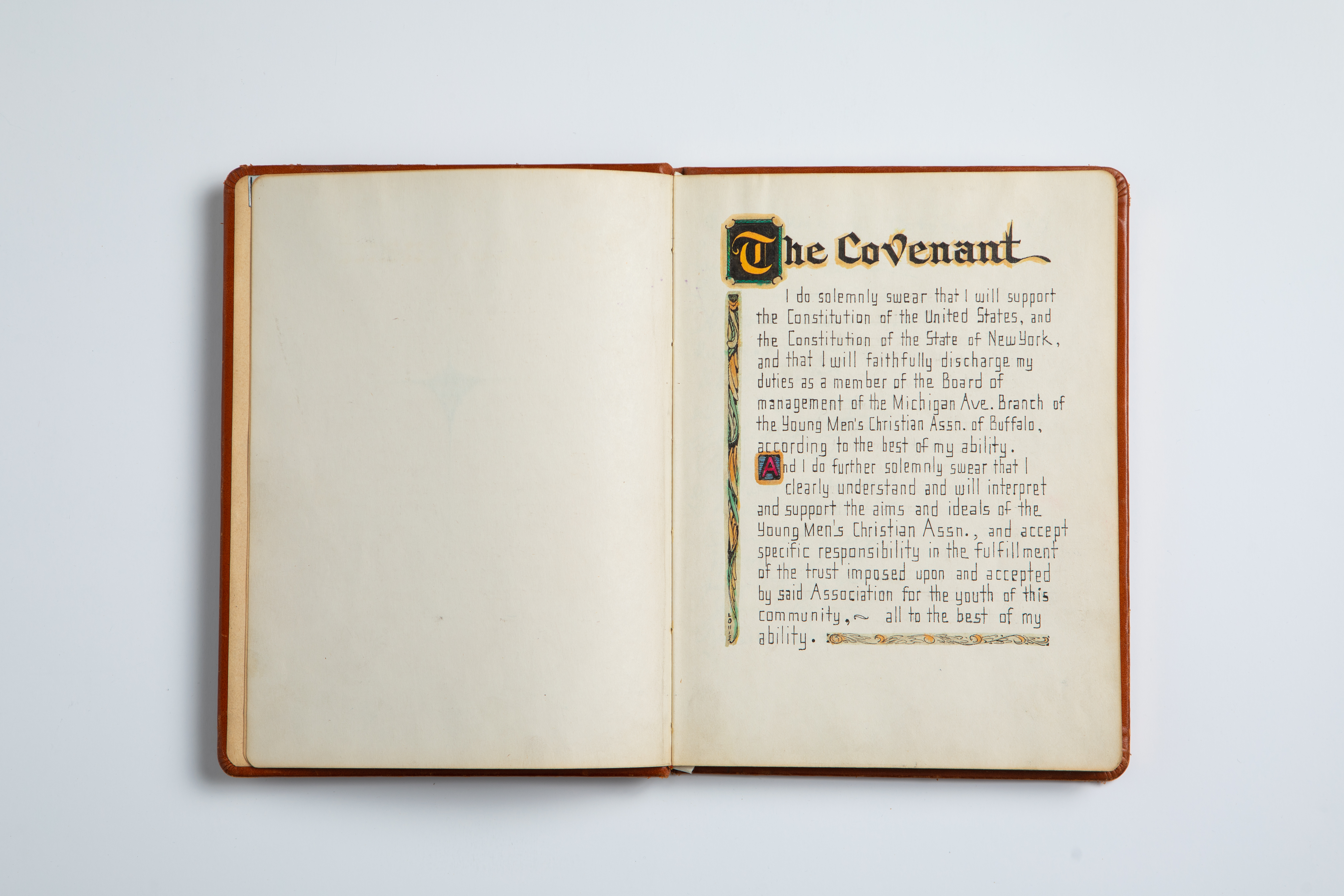 A leather-bound book containing the "Covenant" of the Michigan Avenue Y.M.C.A. in Buffalo, signed by members of the Board of Managers between 1947 and 1966. The book is part of a collection preserved by Lillian S. Williams, who partnered with the Y.M.C.A branch to house its records at the University Archives, University at Buffalo, the State University of New York. Williams was first vice-president of the Afro-American Historical Association of the Niagara Frontier at the time she collected the items as part of the association’s initiative to preserve records pertaining to Buffalo's African American community. Credit: Douglas Levere / University at Buffalo