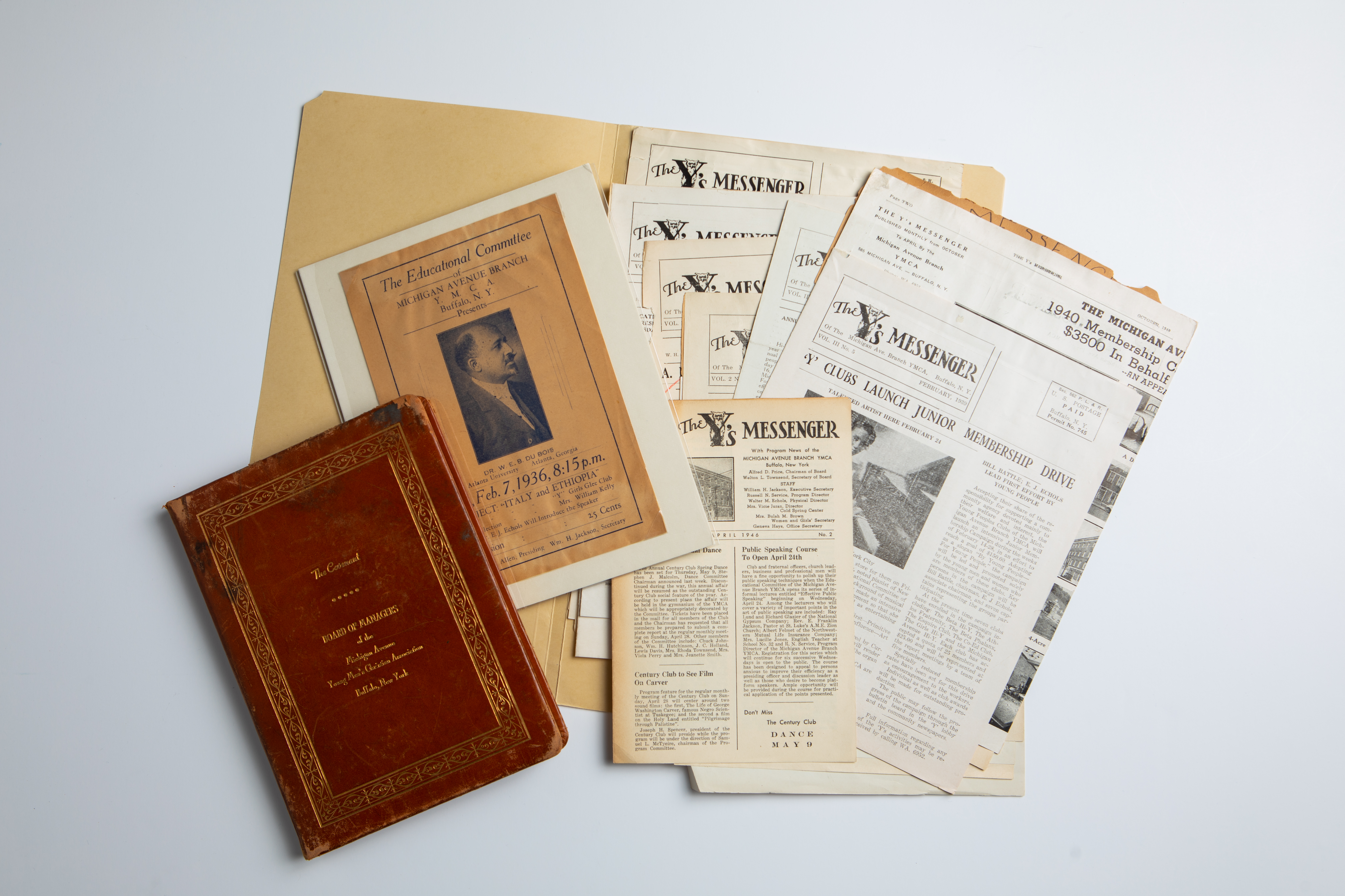 A leather-bound book containing the "Covenant" of the Michigan Avenue Y.M.C.A. in Buffalo, a flyer advertising an event with W. E. B. Du Bois, and copies of “The Y's Messenger” newsletter. The items are part of a collection preserved by Lillian S. Williams, who partnered with the Y.M.C.A branch to house its records at the University Archives, University at Buffalo, the State University of New York. Williams was first vice-president of the Afro-American Historical Association of the Niagara Frontier at the time she collected the items as part of the association’s initiative to preserve records pertaining to Buffalo's African American community. Credit: Douglas Levere / University at Buffalo