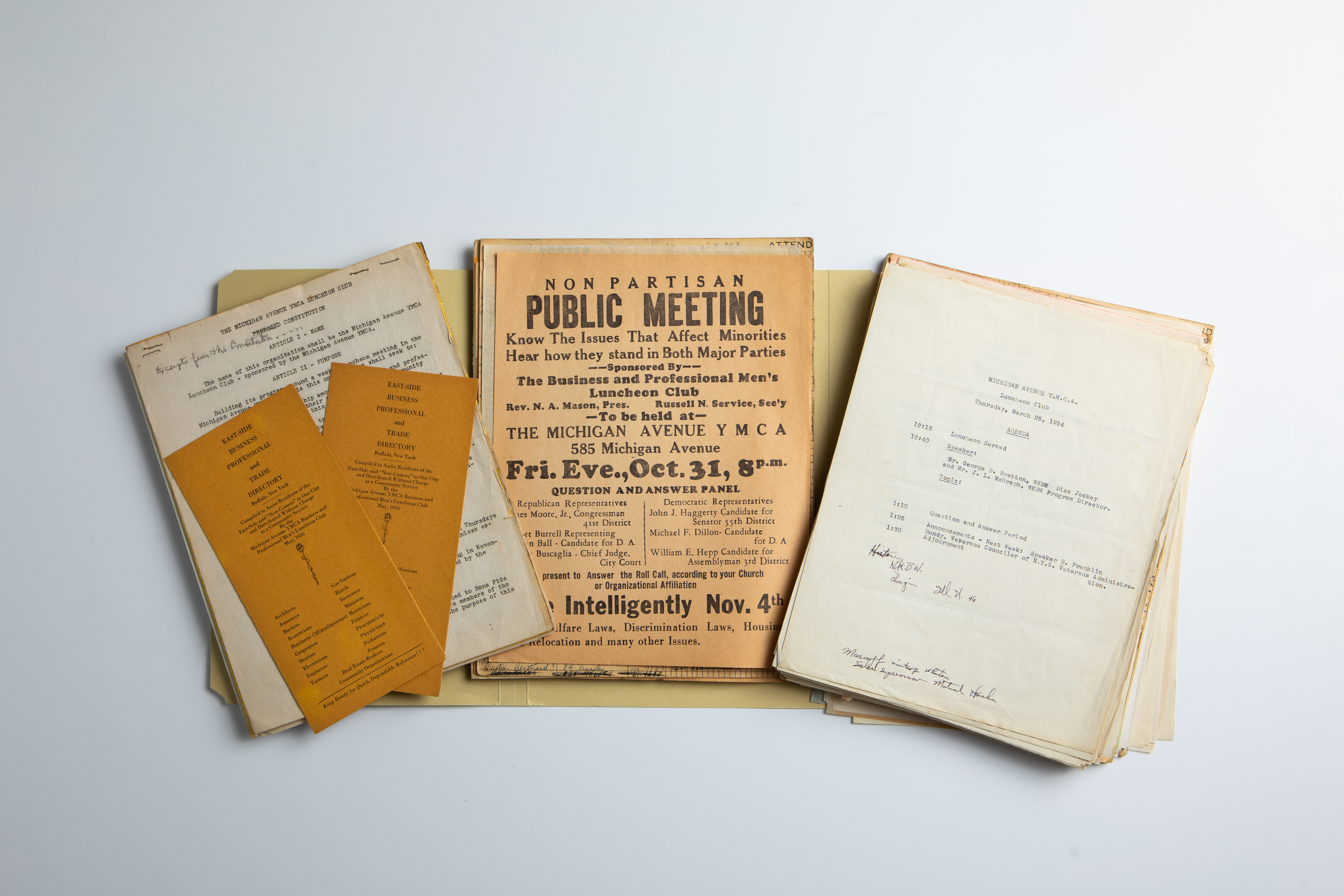Old records from the Michigan Avenue Y.M.C.A. in Buffalo include items such as an East Side Business Professional and Trade Directory, a flyer for a public meeting with political candidates, and a luncheon club agenda. The items are part of a collection preserved by Lillian S. Williams, who partnered with the Y.M.C.A branch to house its records at the University Archives, University at Buffalo, the State University of New York. Williams was first vice-president of the Afro-American Historical Association of the Niagara Frontier at the time she collected the items as part of the association’s initiative to preserve records pertaining to Buffalo's African American community. Credit: Douglas Levere / University at Buffalo