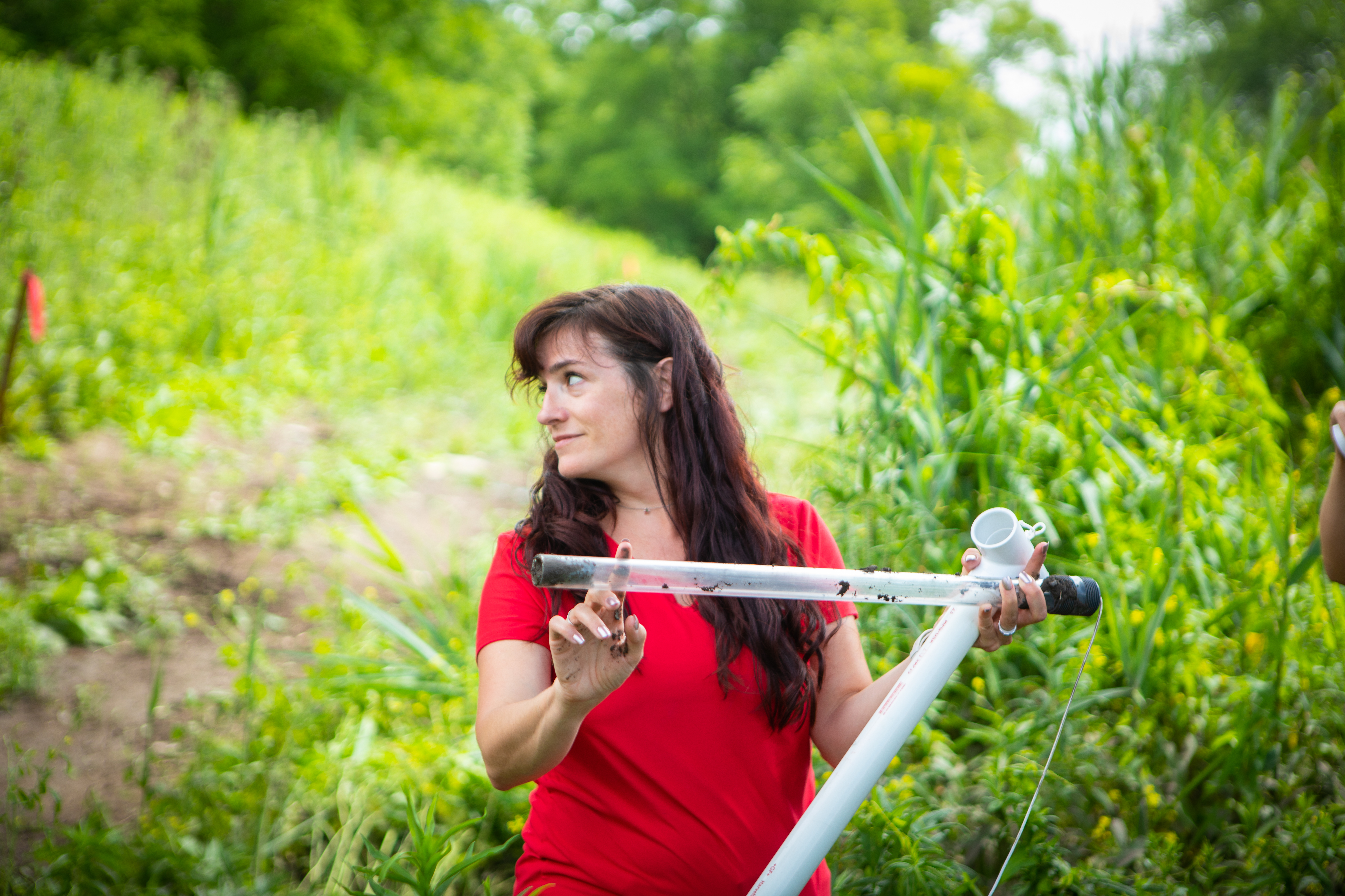 Heather Thuman, earth sciences teacher at Williamsville North High School, shows off a sediment core. As part of the EarthEd Institute at UB, K-12 teachers took a trip to Bizer Creek on UB’s North Campus to collect sediment cores, which they later analyzed in the lab — hands-on science that can be replicated in K-12 classrooms. Credit: Douglas Levere / University at Buffalo