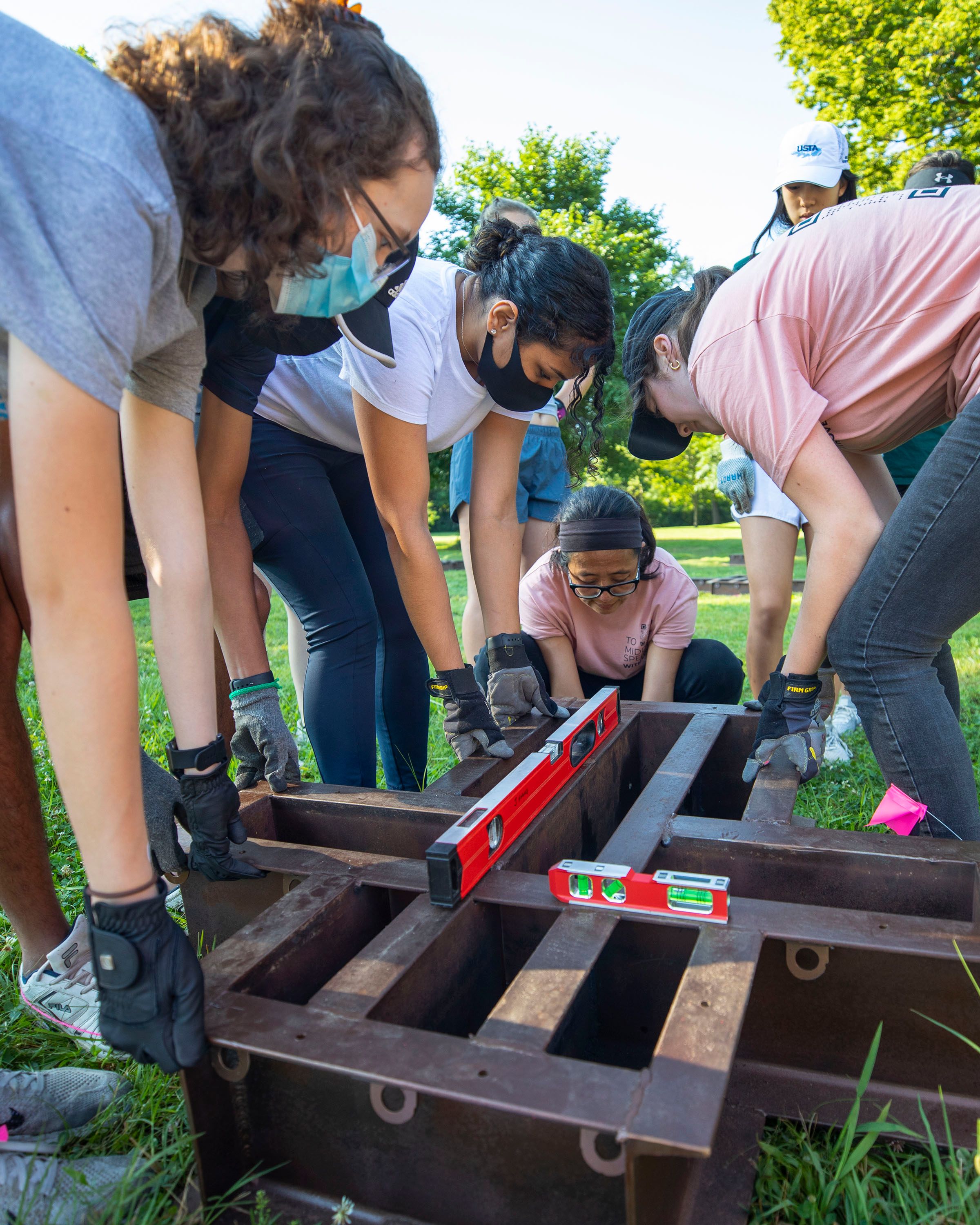 A team of student volunteers from the environmental club at Columbus North High School in Indiana helped UB architecture professor Joyce Hwang (far left) assemble the base structures for To Middle Species, With Love. Photo: Hadley Fruits