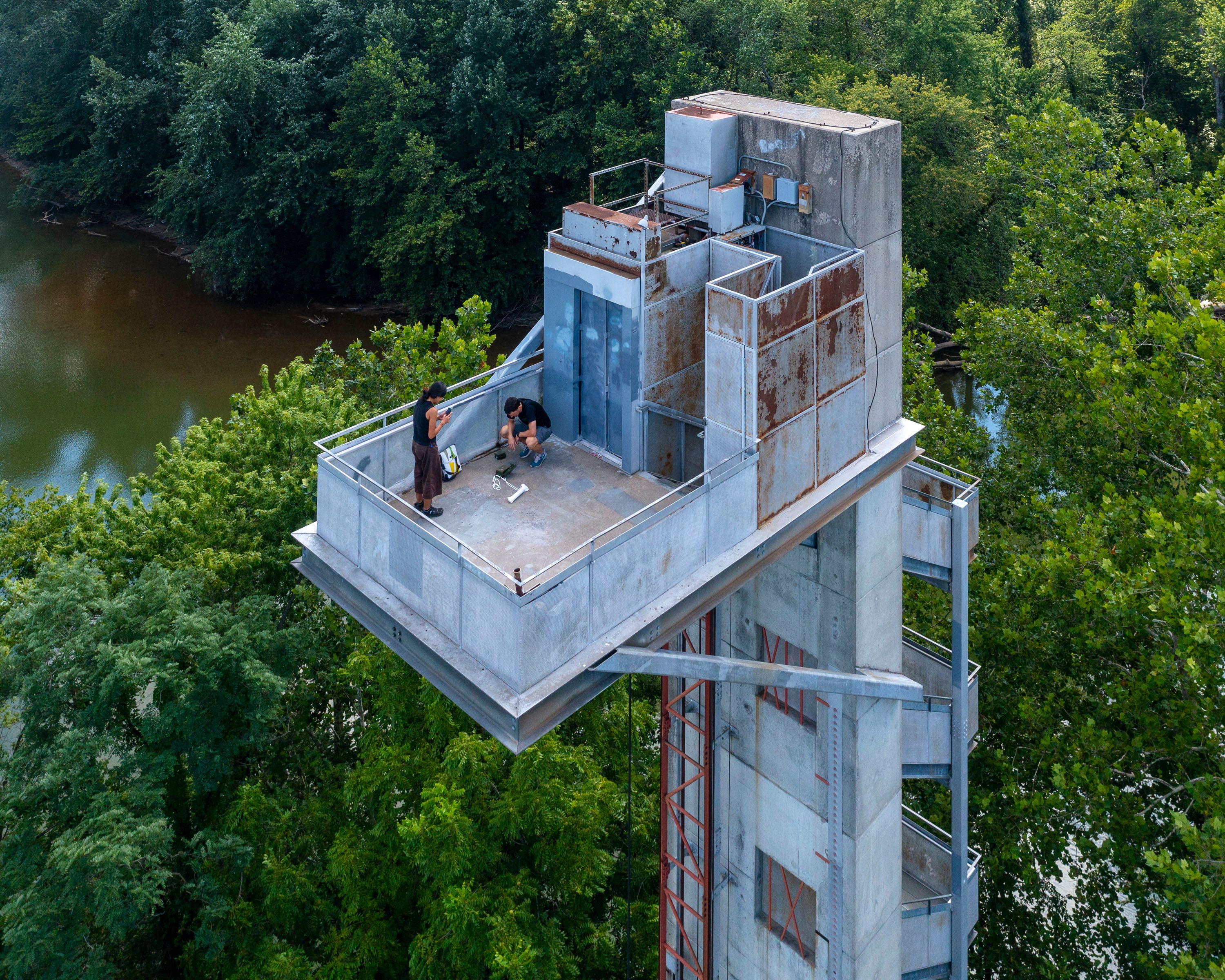 Ultrasonic detectors placed at the top of the 84-foot-tall observation tower in Mill Race Park will regularly record bat calls. The recordings will be accessible to visitors, both in-person and through online platforms. Photo: Hadley Fruits