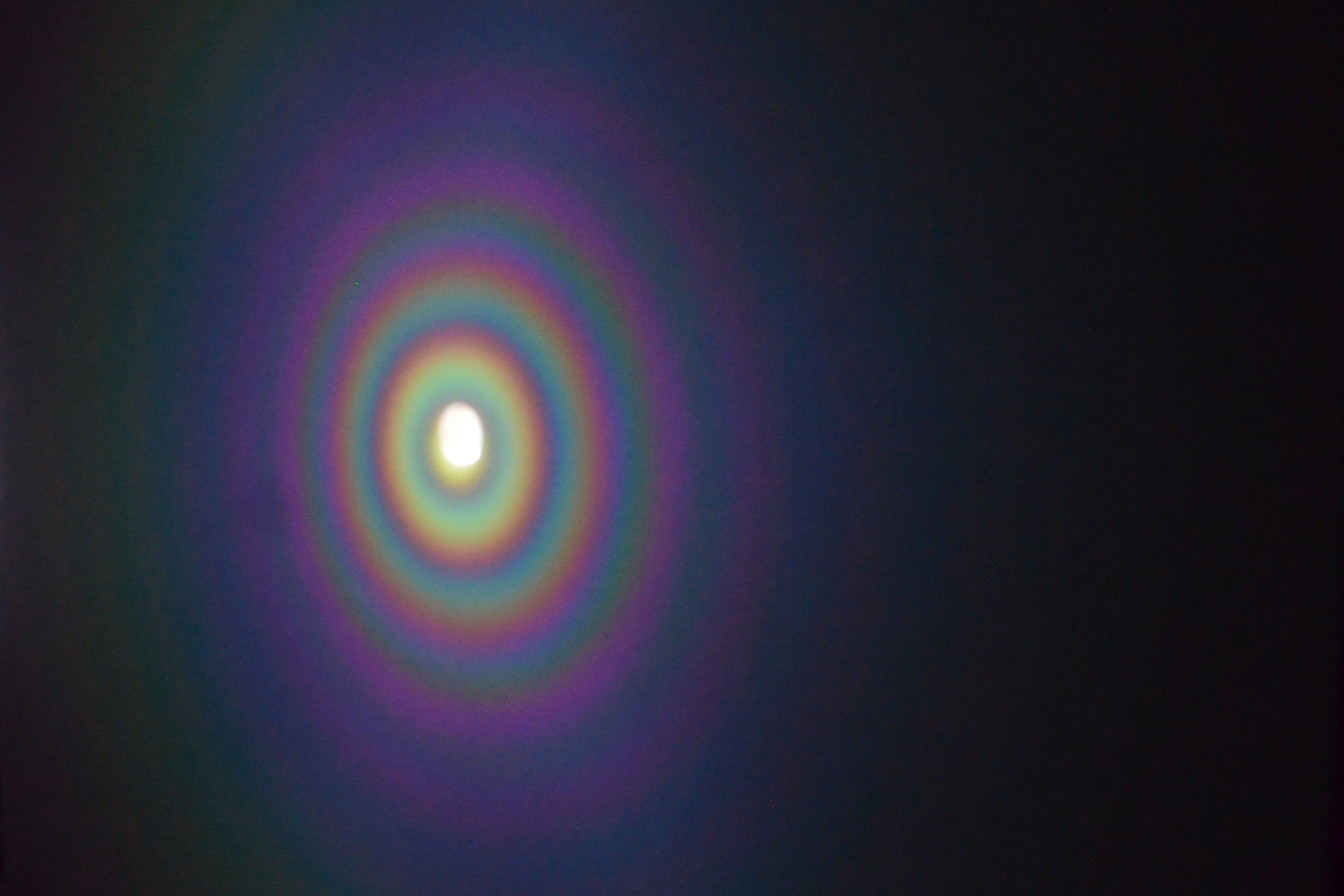White light shining on this film is reflected in a way that causes the light to create concentric rainbow rings, the new paper reports. Alternately, hitting the material with a single-colored laser (red, green or blue, in the case of this study) generates a pattern of bright and dark rings. Reflections from infrared lasers also produced distinctive signals consisting of concentric rings.