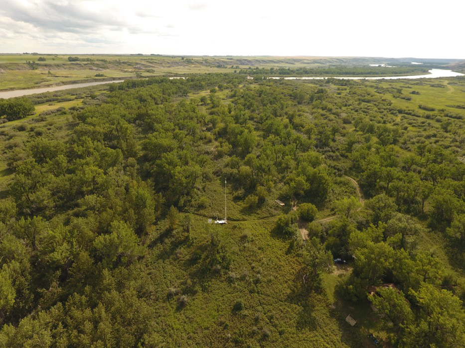 A cottonwood forest adjacent to the Red Deer River in Alberta, Canada. In a 2021 study, researchers present new techniques for modeling the impact of climate change on riparian forests of this kind. Visible in the photo is an eddy covariance flux tower — a type of scientific installation that was used in the new study. Credit: Laurens J. Philipsen