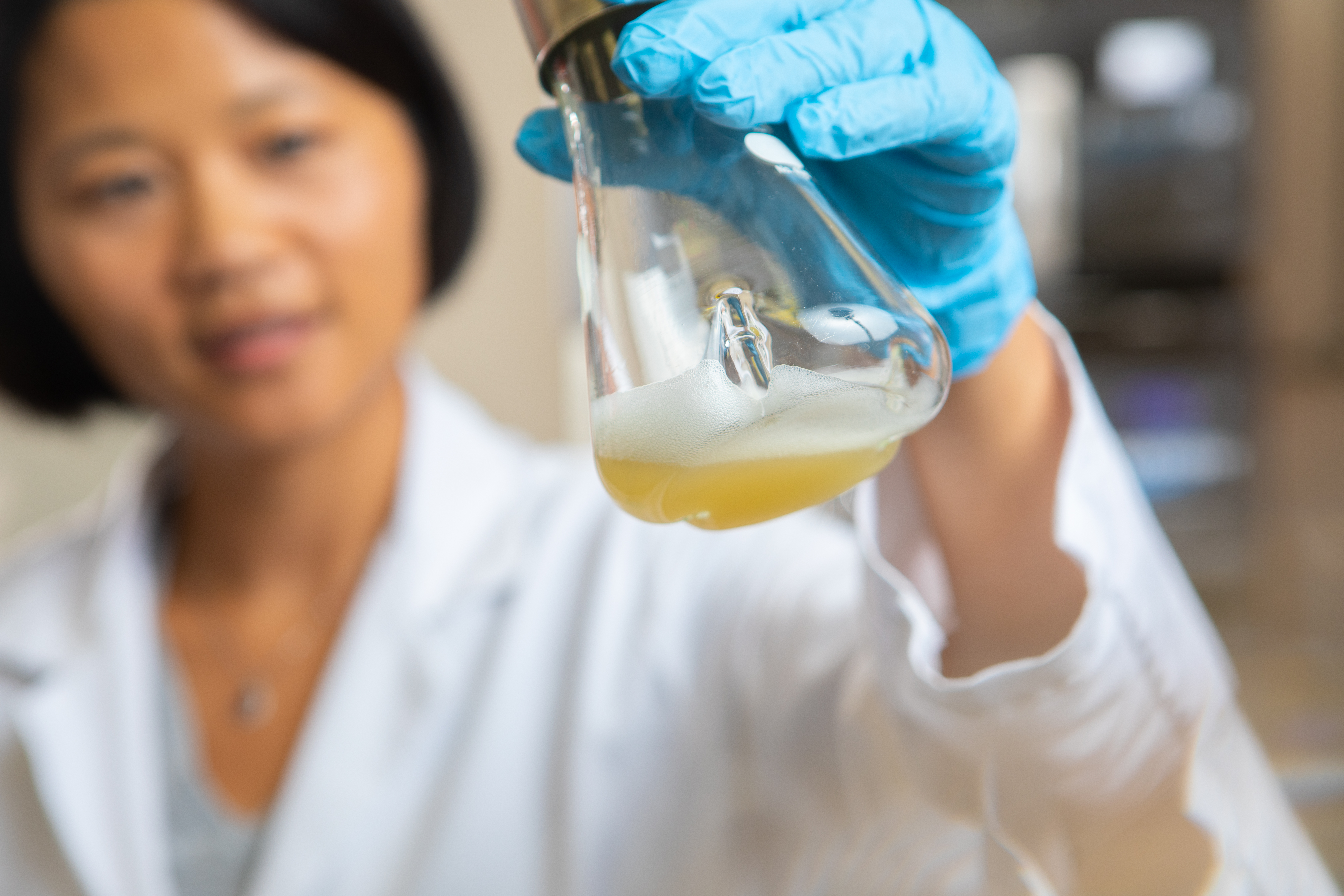 A strain of E. coli that doesn’t endanger human health grows in a flask full of nutrients (the yellow broth). In a study, scientists genetically engineered such E. coli to convert glucose into a class of fatty acids, which the team then transformed into a hydrocarbon called an olefin. Credit: Douglas Levere / University at Buffalo