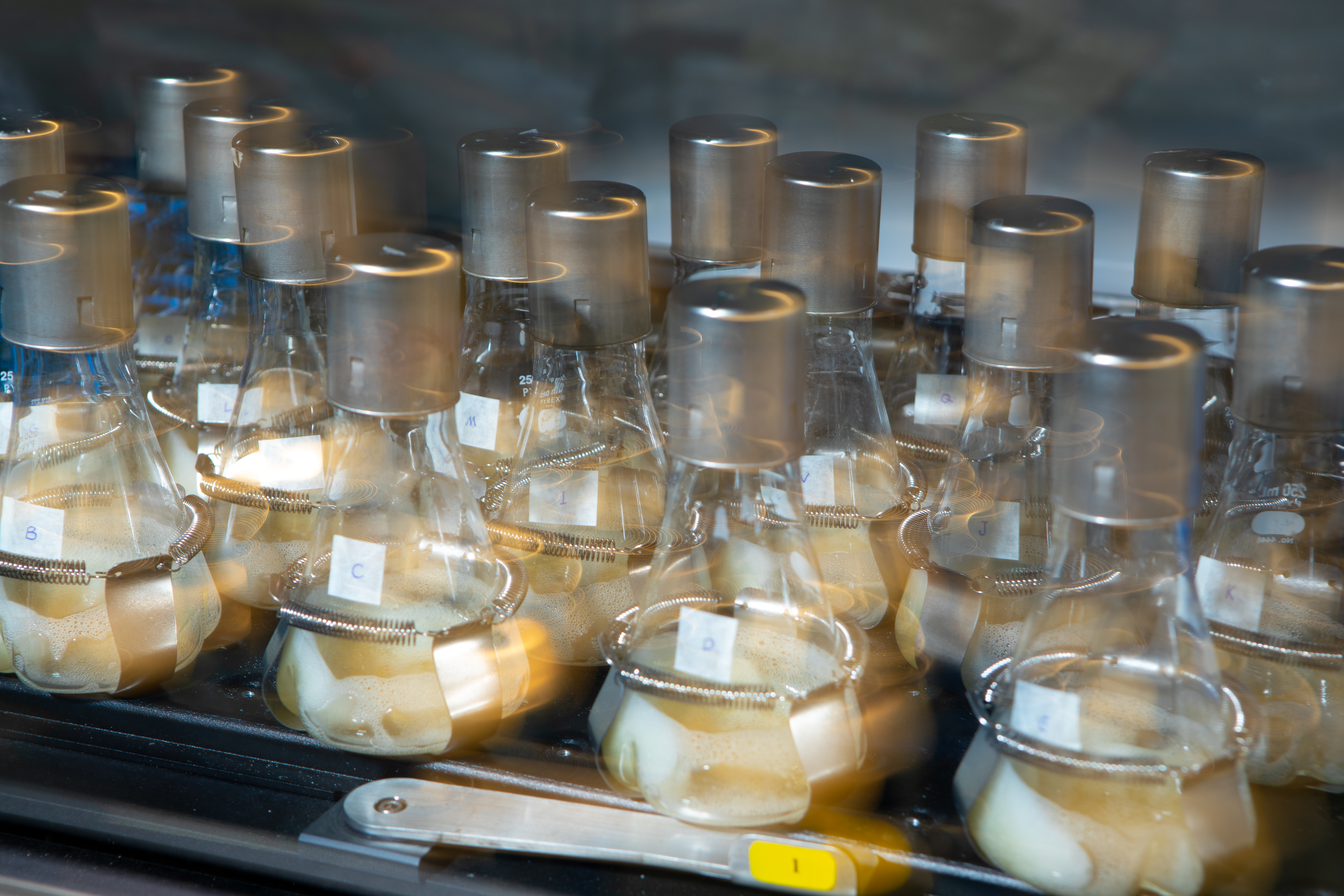Genetically engineered bacteria can convert glucose into a fatty acid, which can then be transformed into hydrocarbons called olefins. To grow such bacteria, scientists add the microbes to flasks filled with nutrients (the yellow broth) and shake them in an incubator to encourage oxygen flow, as pictured here. Credit: Douglas Levere / University at Buffalo