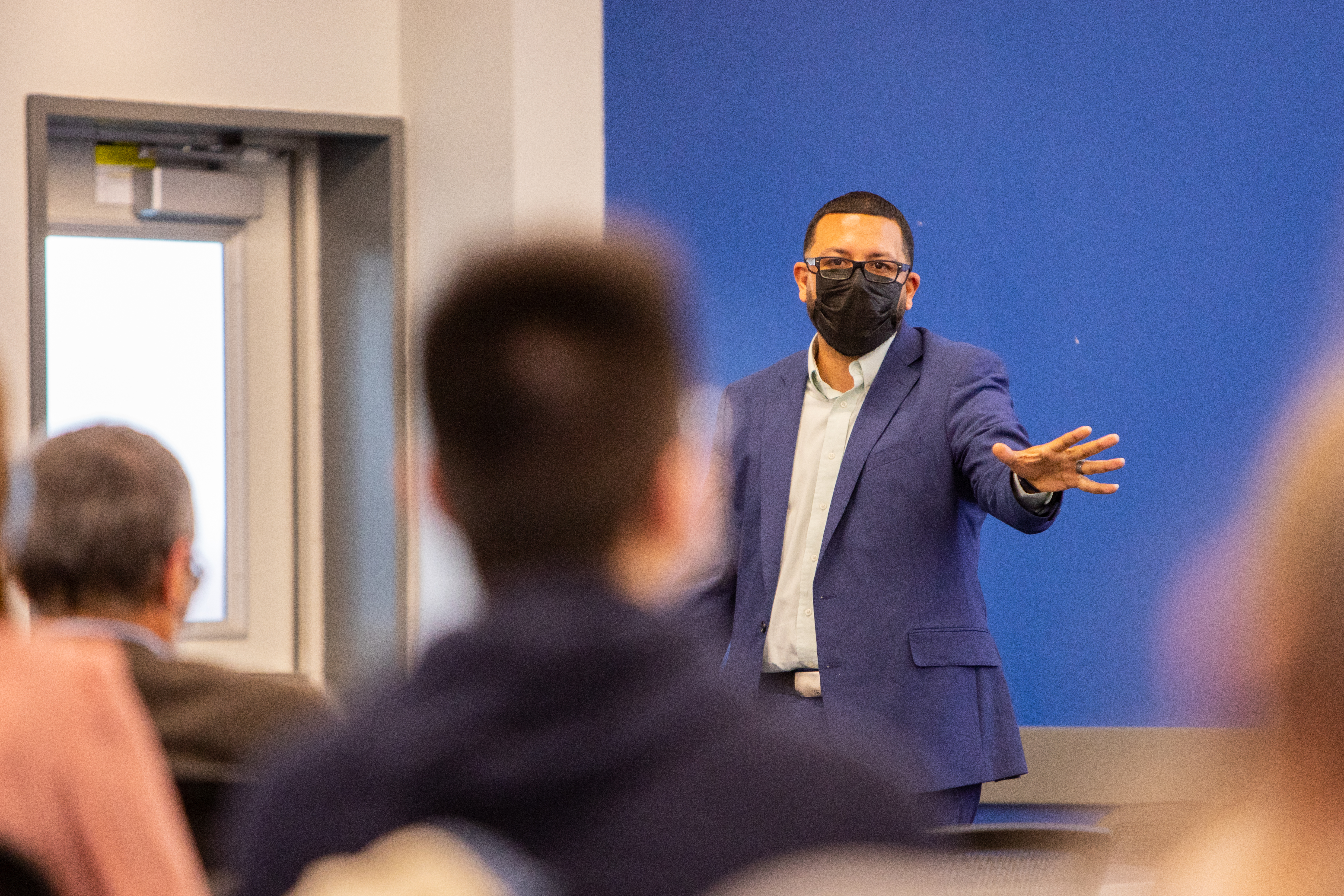 Jesús M. Velázquez, assistant professor at the University of California, Davis, delivered a lecture on electrocatalysts and materials science in December 2021 as part of the UB chemistry department’s Foster Colloquium Series. Velázquez earned his PhD at UB. Credit: Meredith Forrest Kulwicki / University at Buffalo