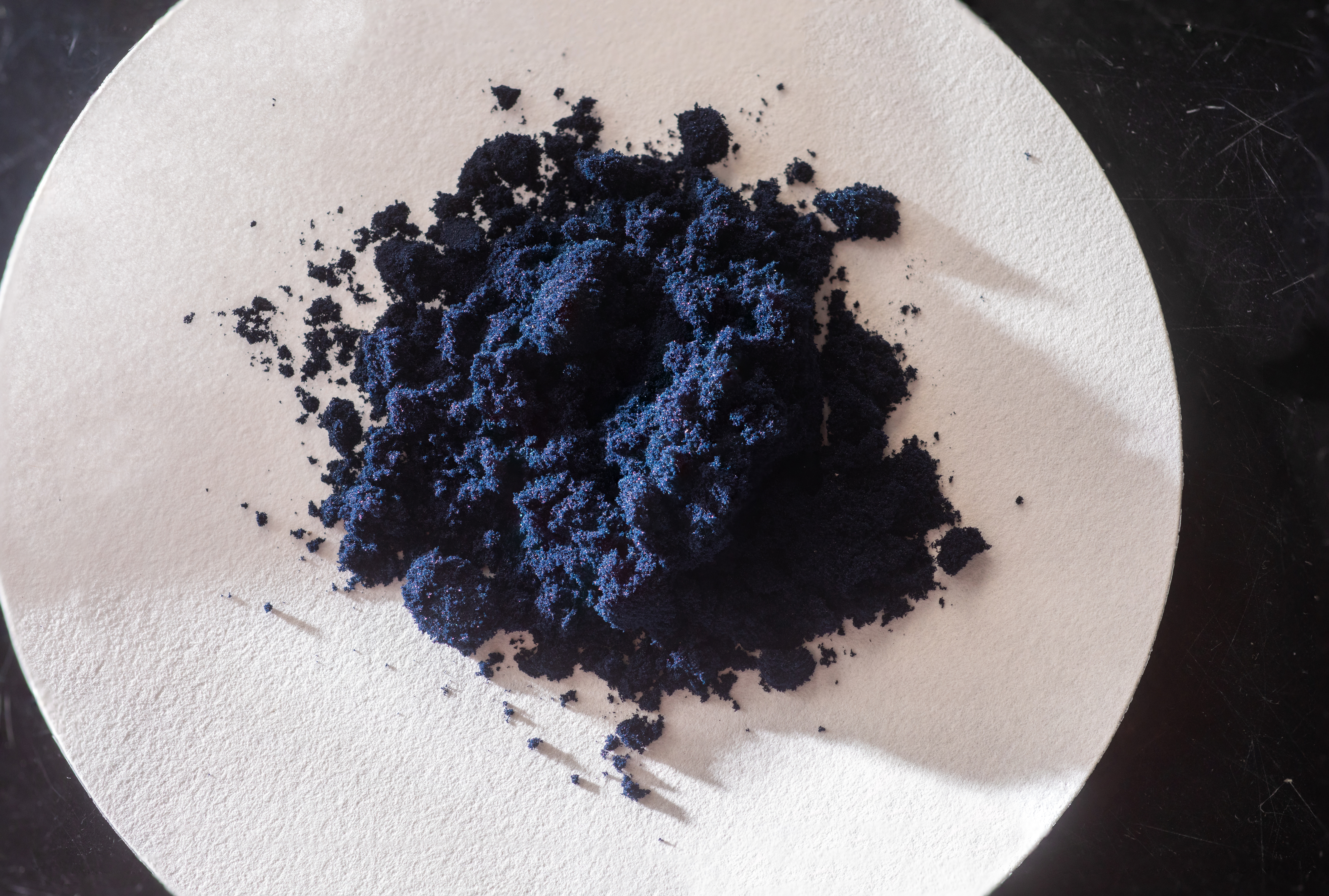 This midnight blue powder, MnCl3(OPPh3)2, provides scientists with a readily available source of manganese trichloride. This image is a composite that employs a technique called focus-stacking to show details more clearly. Credit: Douglas Levere / University at Buffalo