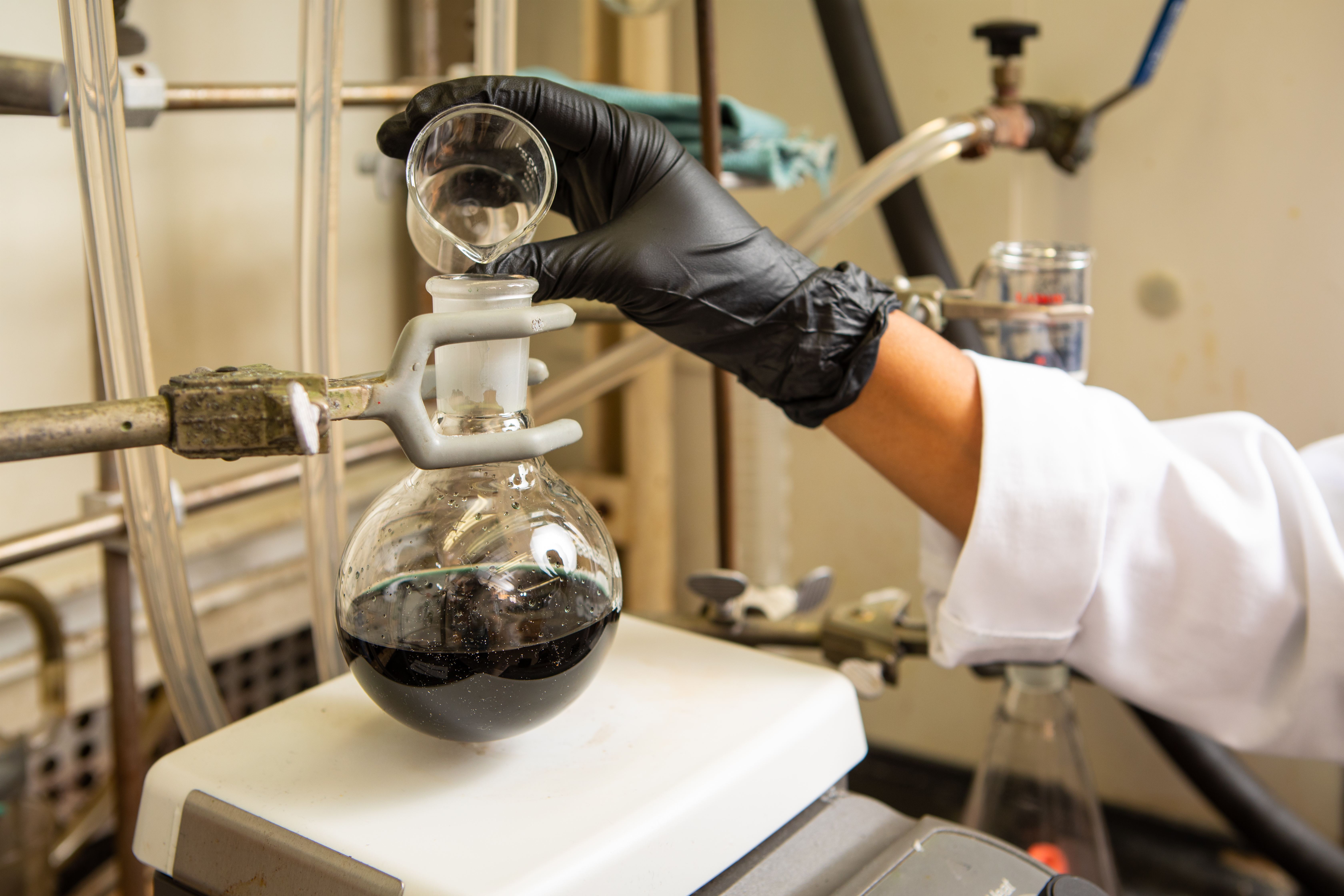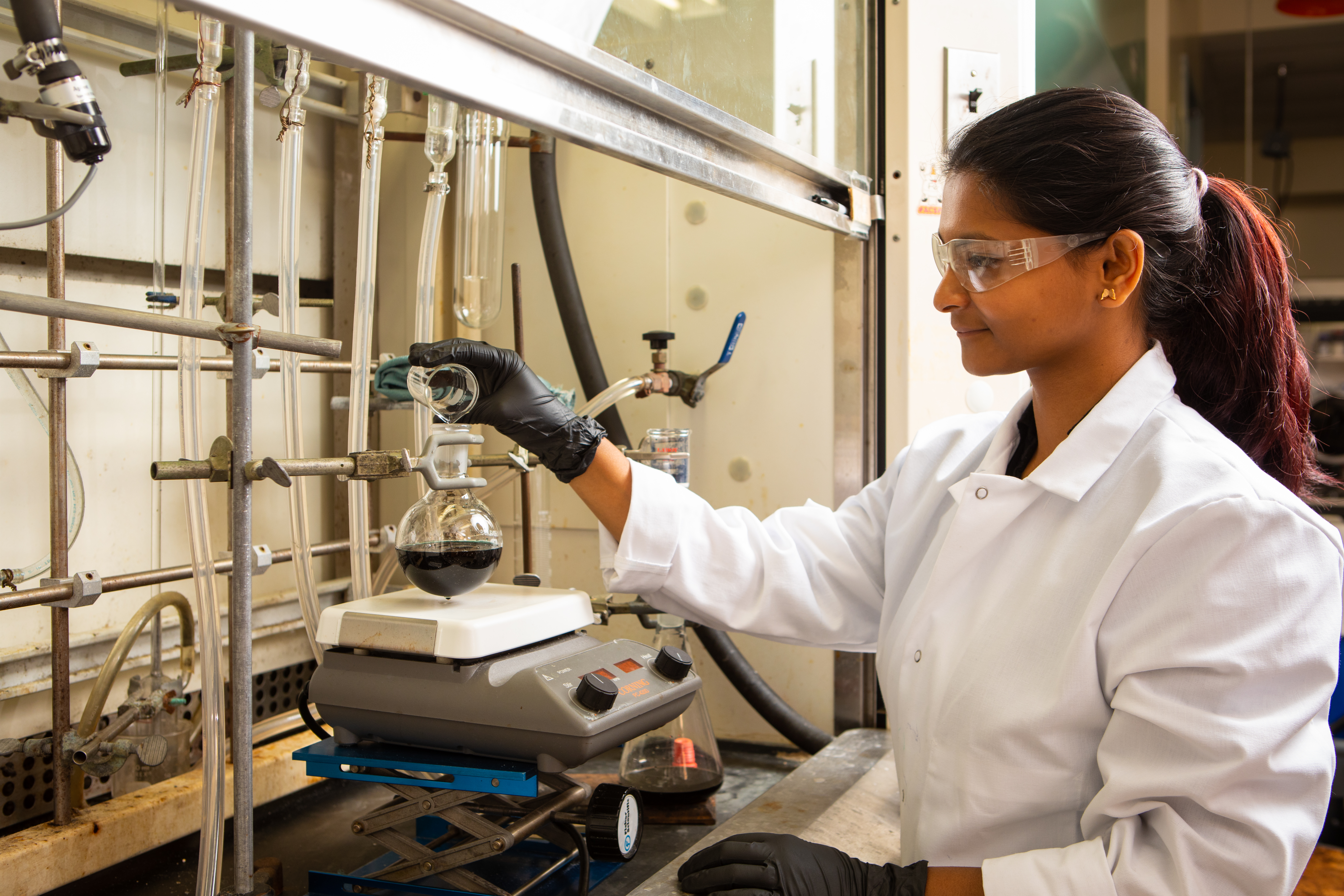 Ananya Saju, UB PhD student in chemistry, carries out the reaction that is used to stabilize manganese trichloride. The work involves fixing a stabilizing agent to MnCl3 that prevents it from indiscriminately shedding chlorine atoms, as it would normally do. Credit: Douglas Levere / University at Buffalo